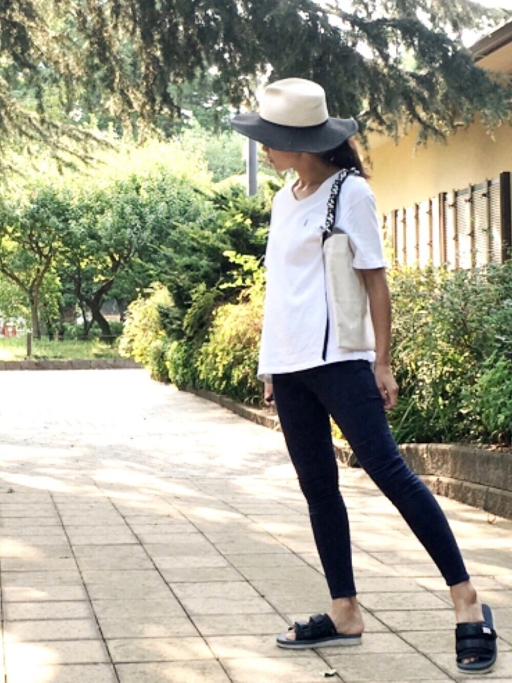 公園コーデは⛲️Tシャツ&スキニーパンツが定番‼️ つば広ハットとパールバッグで大人カジュアル😋