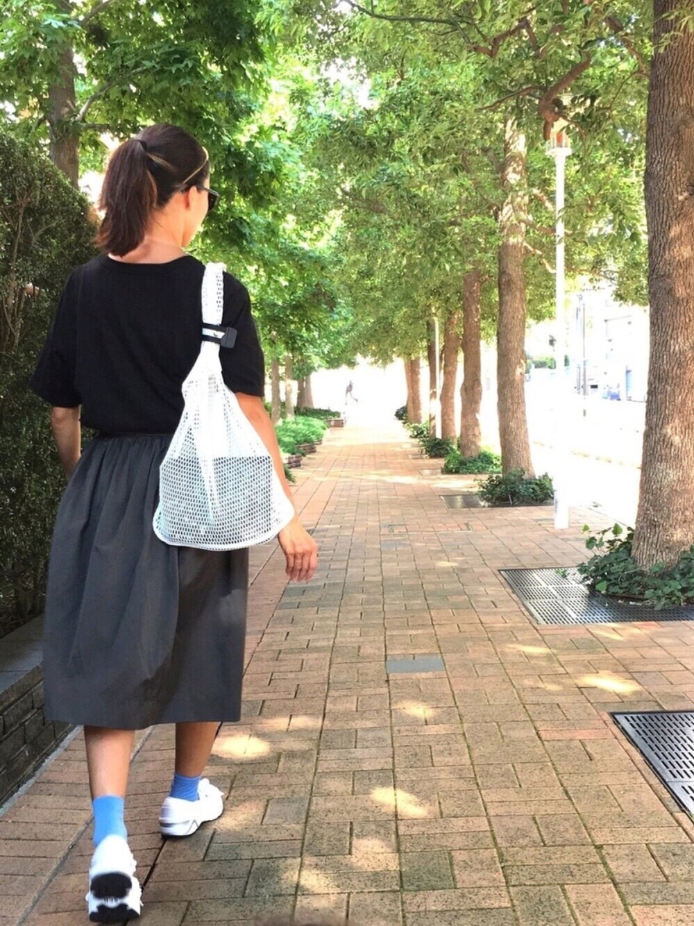 黒Tとカーキスカートで色は抑えめにして、メッシュバッグとスニーカーのホワイトをポイントに❤️