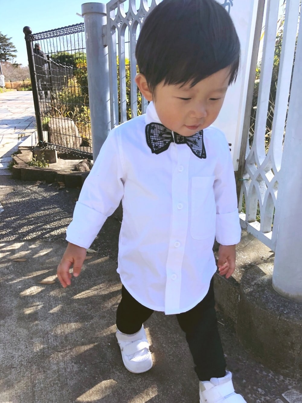 息子コーデ😋 SUPERTHANKS KIDSの蝶ネクタイワッペンの柄はトレンドのグレンチェック×星の刺繍⭐️⭐️⭐️ 身長 85cm 体重 12kg 着用サイズ 100cm サイズ100cmでも、お腹ぽっこりなので袖のカフス分を折り返すだけでバランスはいい感じ💕