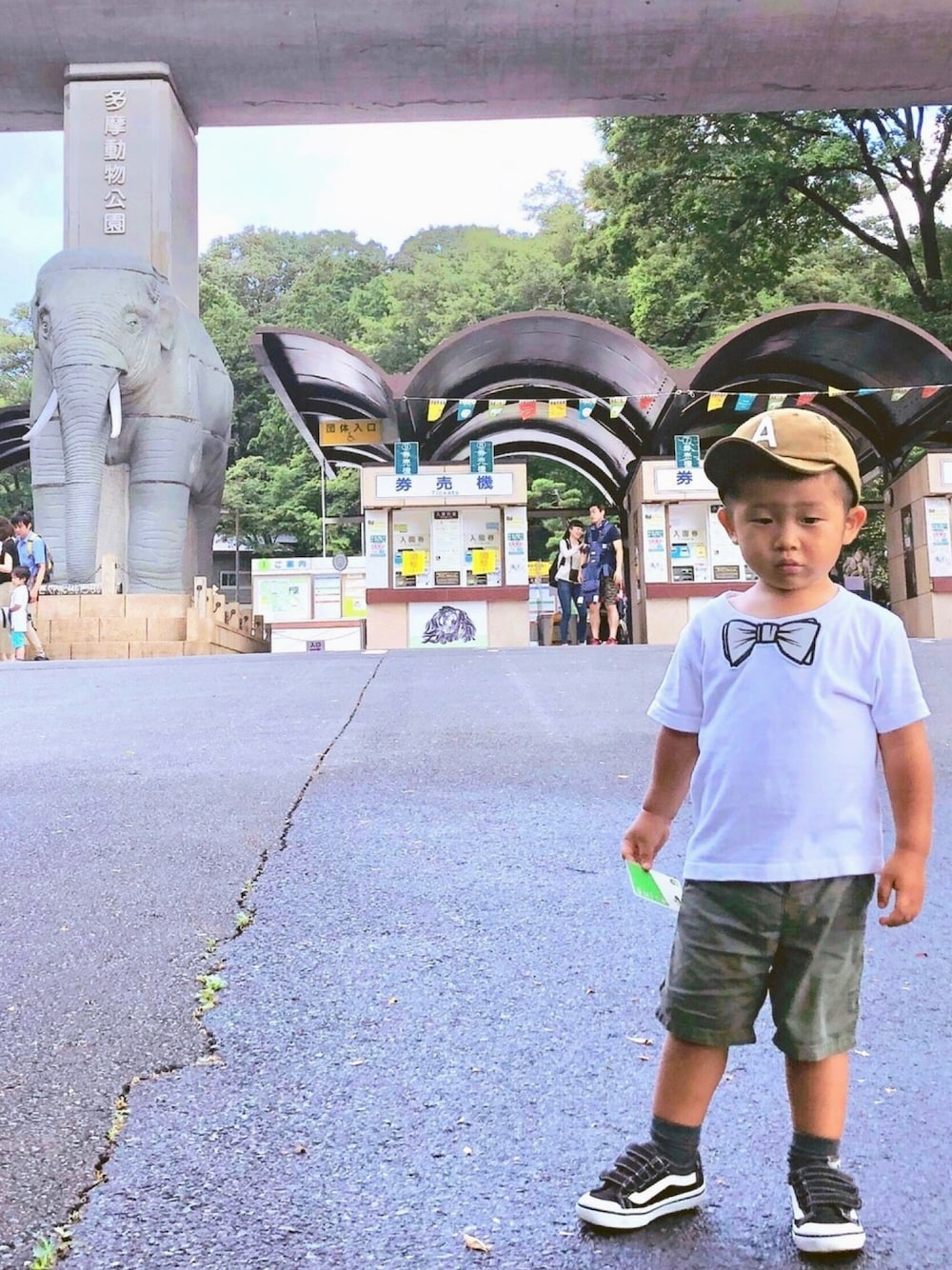 動物園へ🐘 お気に入りの蝶ネクタイは、リフレクター素材🎀 キャップとパンツはカーキで揃えて、ソックスをチャコールにする組み合わせにはまってる😄 サイズ15cmになってやっと購入できたVANS👟👟👟