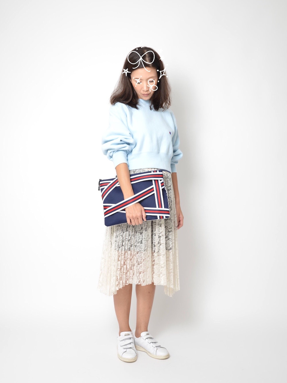 今日の気分☁️☁️☁️ 優しいカラーのスエット&レース🌸 そしてハッキリカラーのネイビークラッチ‼️