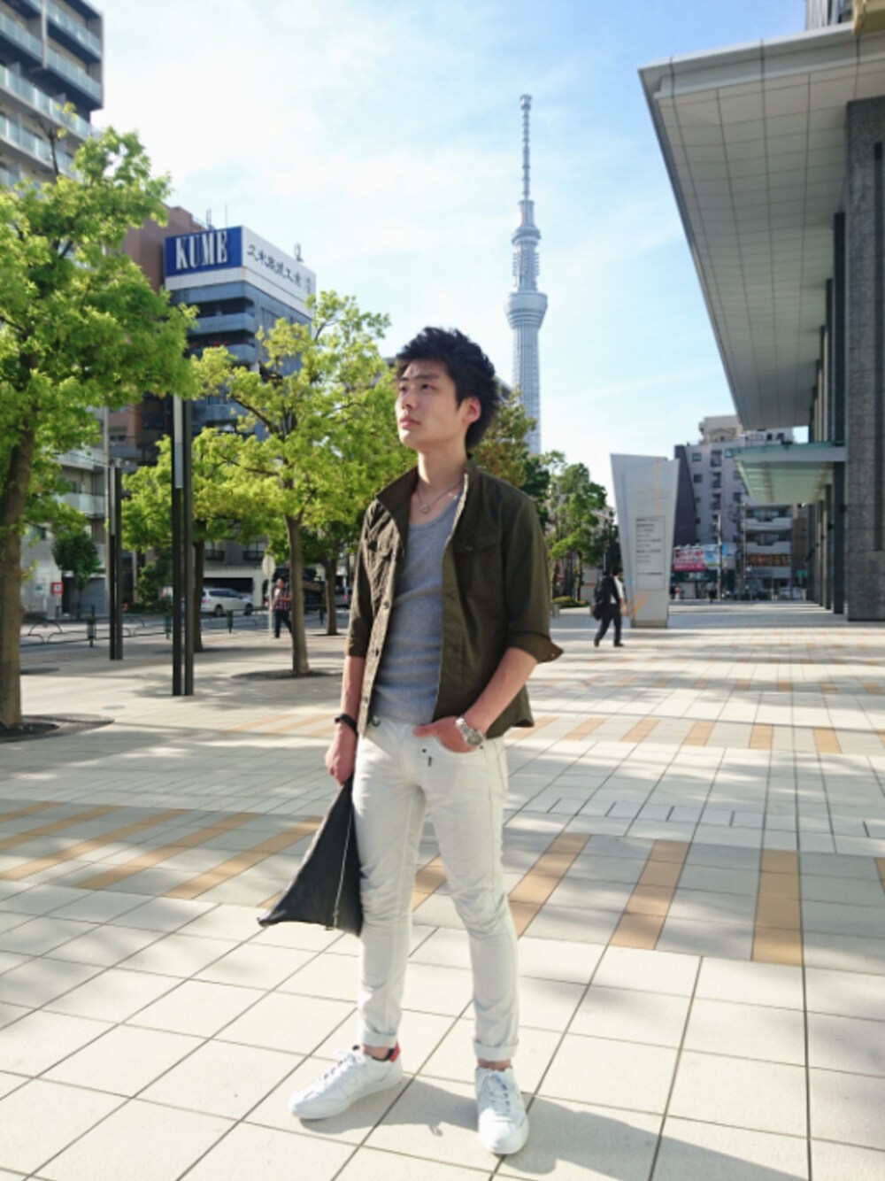本日も錦糸町店の顧客様のK君の登場です! 天気が良かったのでスカイツリーをバックに撮影してみました👍 カーキの七分ブルゾンに白パンツで爽やかにきまっています☺いつもNICOLEをかっこよく着こなしてくれてありがとうございます🙇