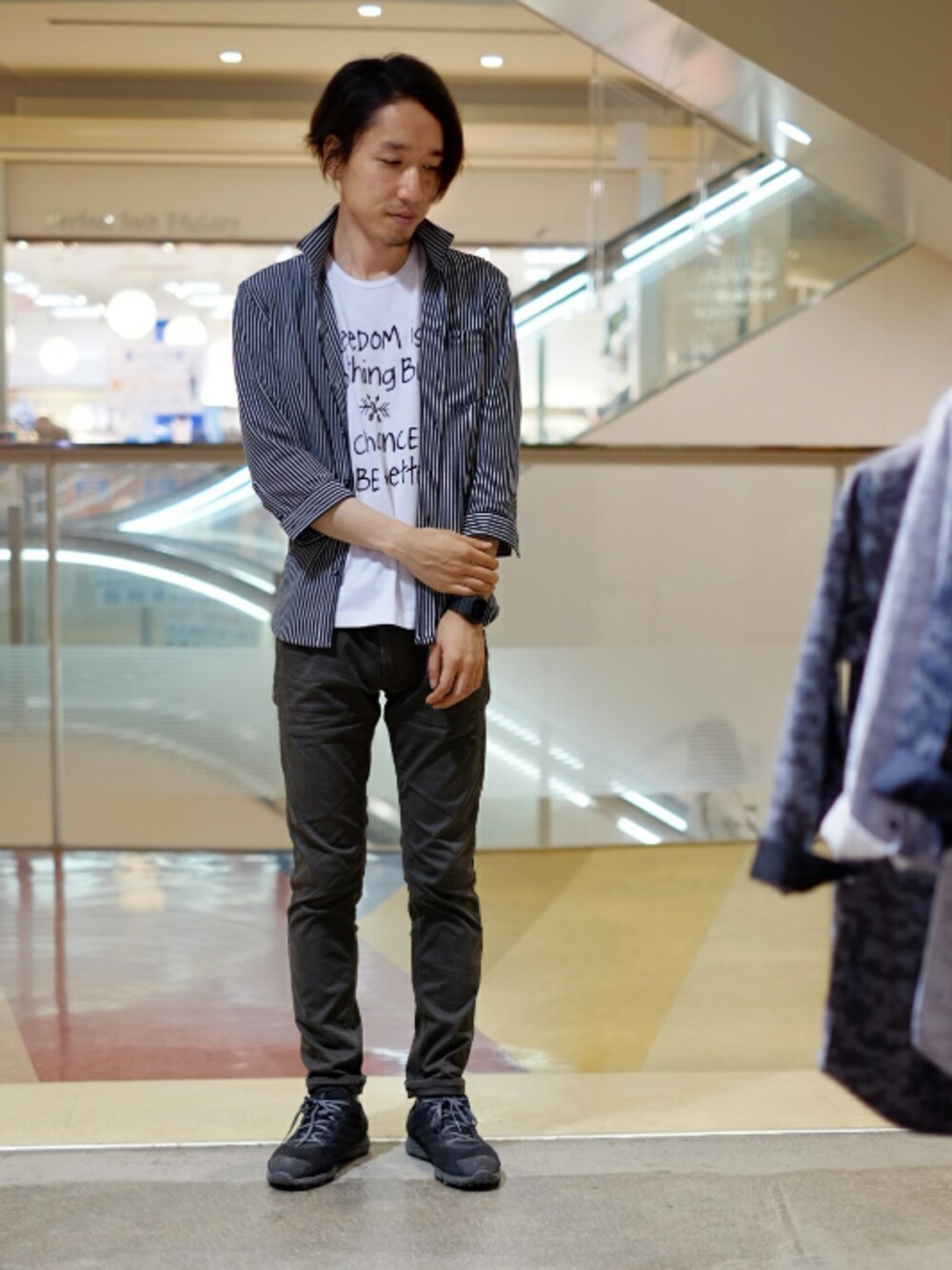 こんばんは! ご観覧ありがとうございます☺ お気に入りのストライプシャツを使ってコーディネートしました。 黒が好きなのですが、夏だとどうしても重くなってしまうので真っ白Tをインしました◎