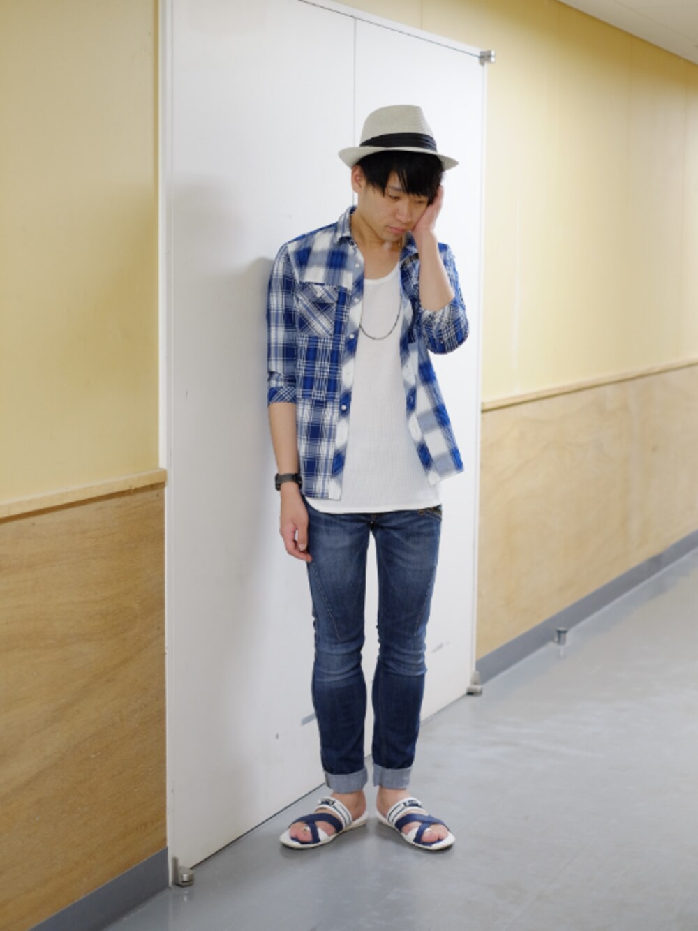 こんばんは! 涼しげなブルーのチェックシャツを使ったコーディネート👍 ロング丈のタンクトップをインナーにしてアクセントをつけました◎