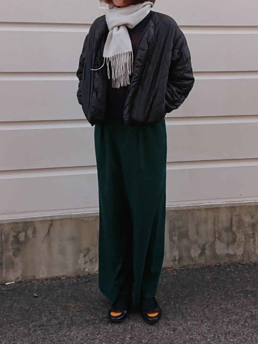 重めなトーンにマフラーでワンポイント、なコーデ。