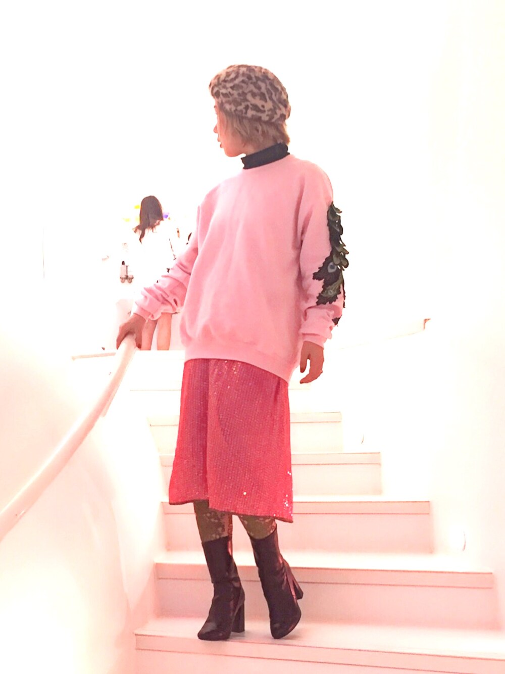 ピンク系のスカートを着用したレディースの秋コーディネートの1枚目の写真