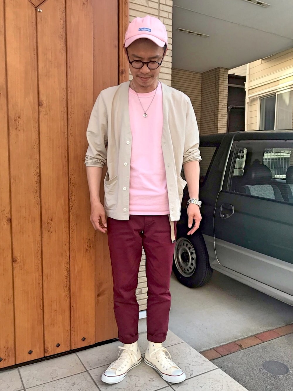 いやぁ、一気に初夏みたい。 パステルピンクとベージュのコーデ。 四千頭身の後藤くんみたい。