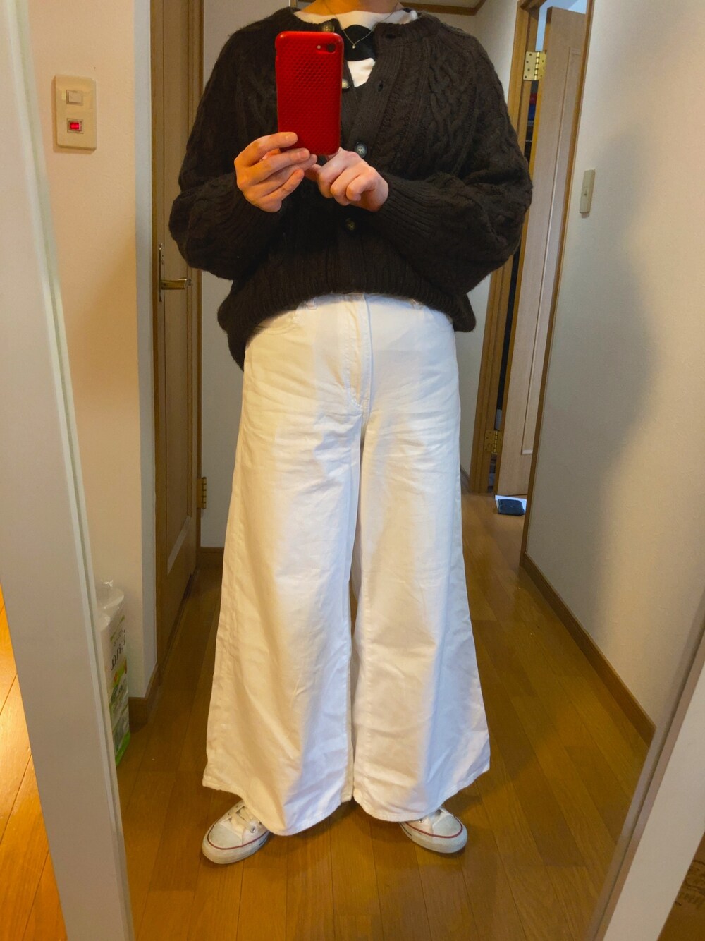 寒くなったり暖かくなったり忙しい。 まだまだニットカーディガンは活躍。 春だし、パンツは白で明るく。 久しぶりにはいてみたら去年より楽に着られるような…