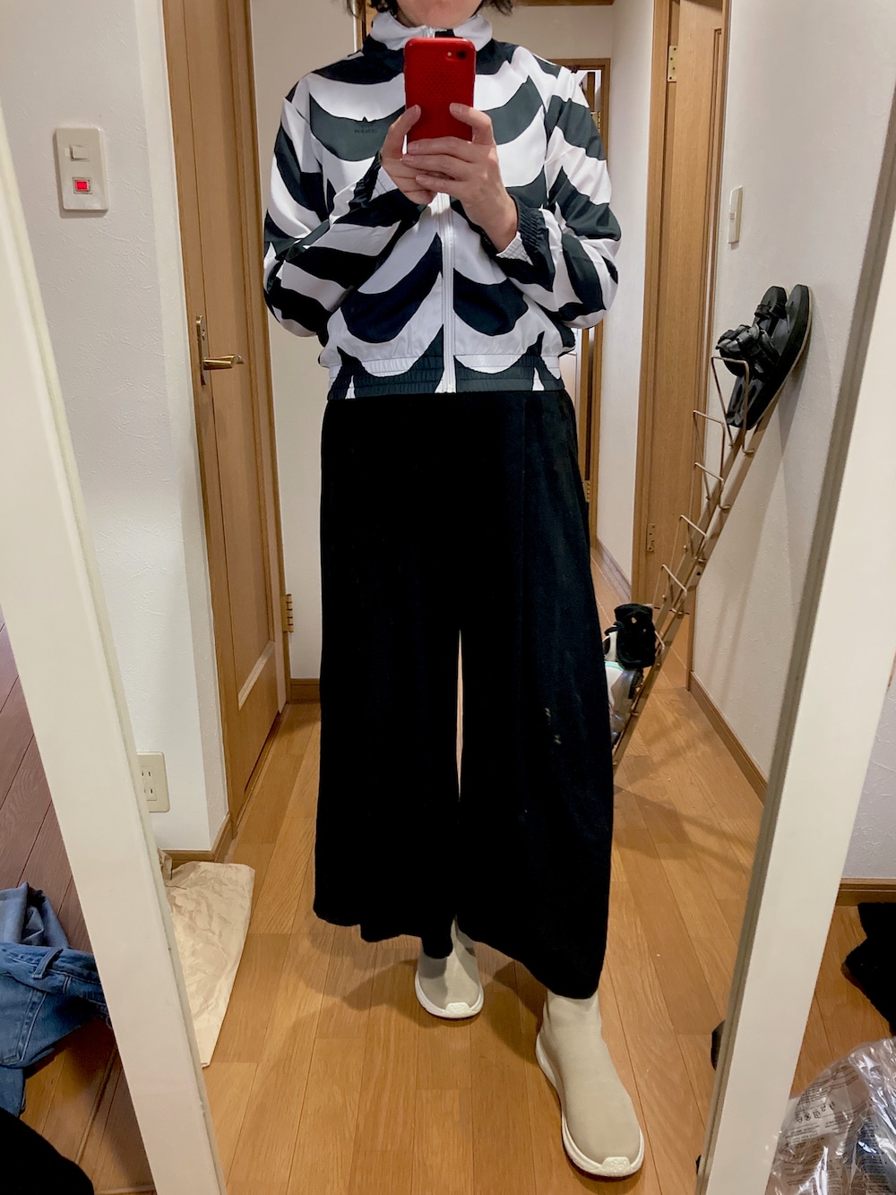 アディダス✖︎マリメッコ❤️ ライネ柄のナイロンジャケット 個性的な柄だけどモノトーンだし、黒ボトム合わせでいけそう さ、ジーユー に取り置きしたブーツを取りに行こうーーっと ノースフェイス のシューズは雨が少なくてあんまり出番なかったけどあったかいからこれからの季節に👍