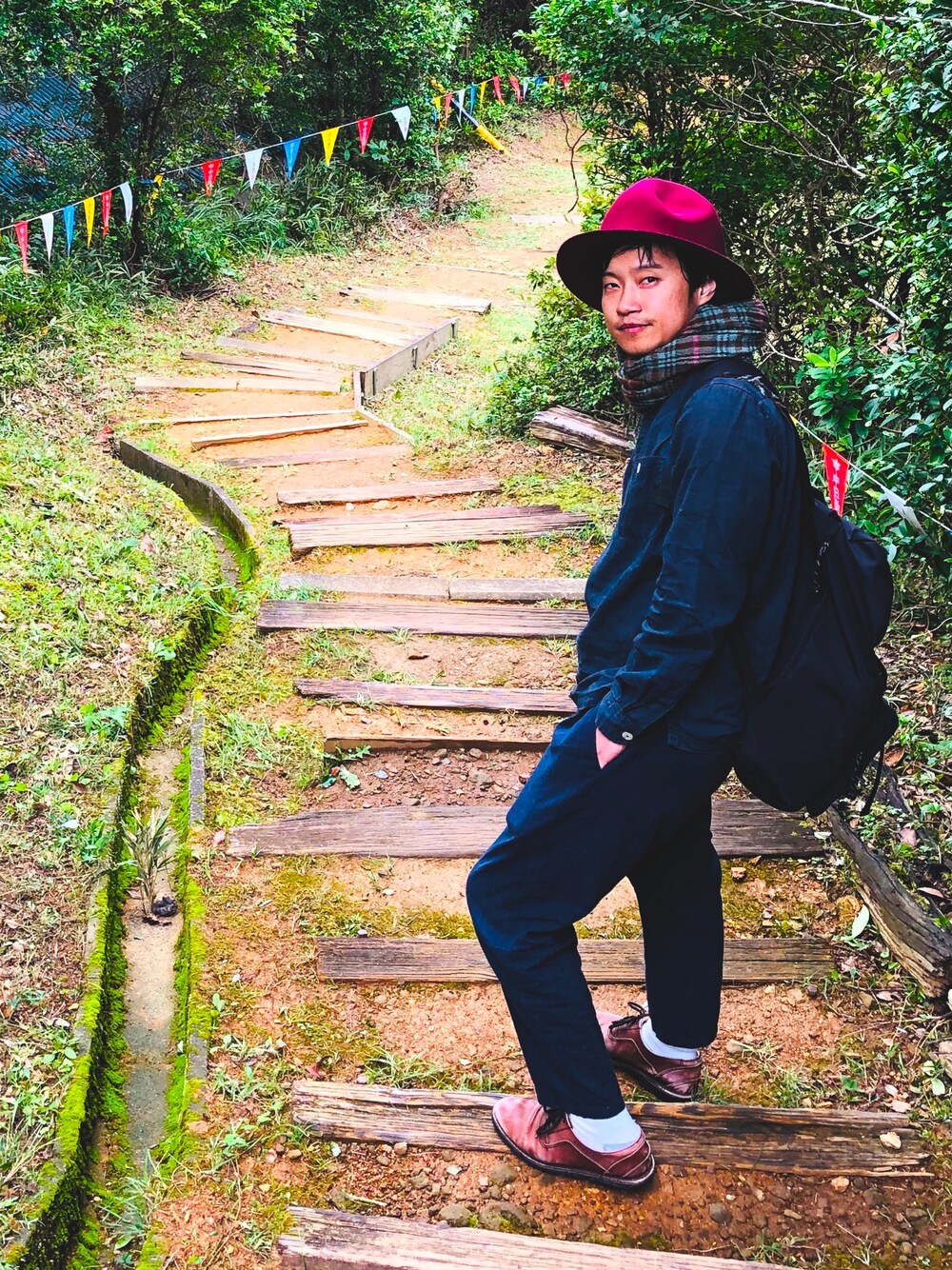 コーデのポイントは、ネイビーのワントーンに映える赤と柄です 旅行のときは楽しみすぎて睡眠不足になります それによる、目の下のクマ そして、アゴのシャクレ さらに、アゴの割れ いやー、激写って面白いっすね ( ͡° ͜ʖ ͡°)