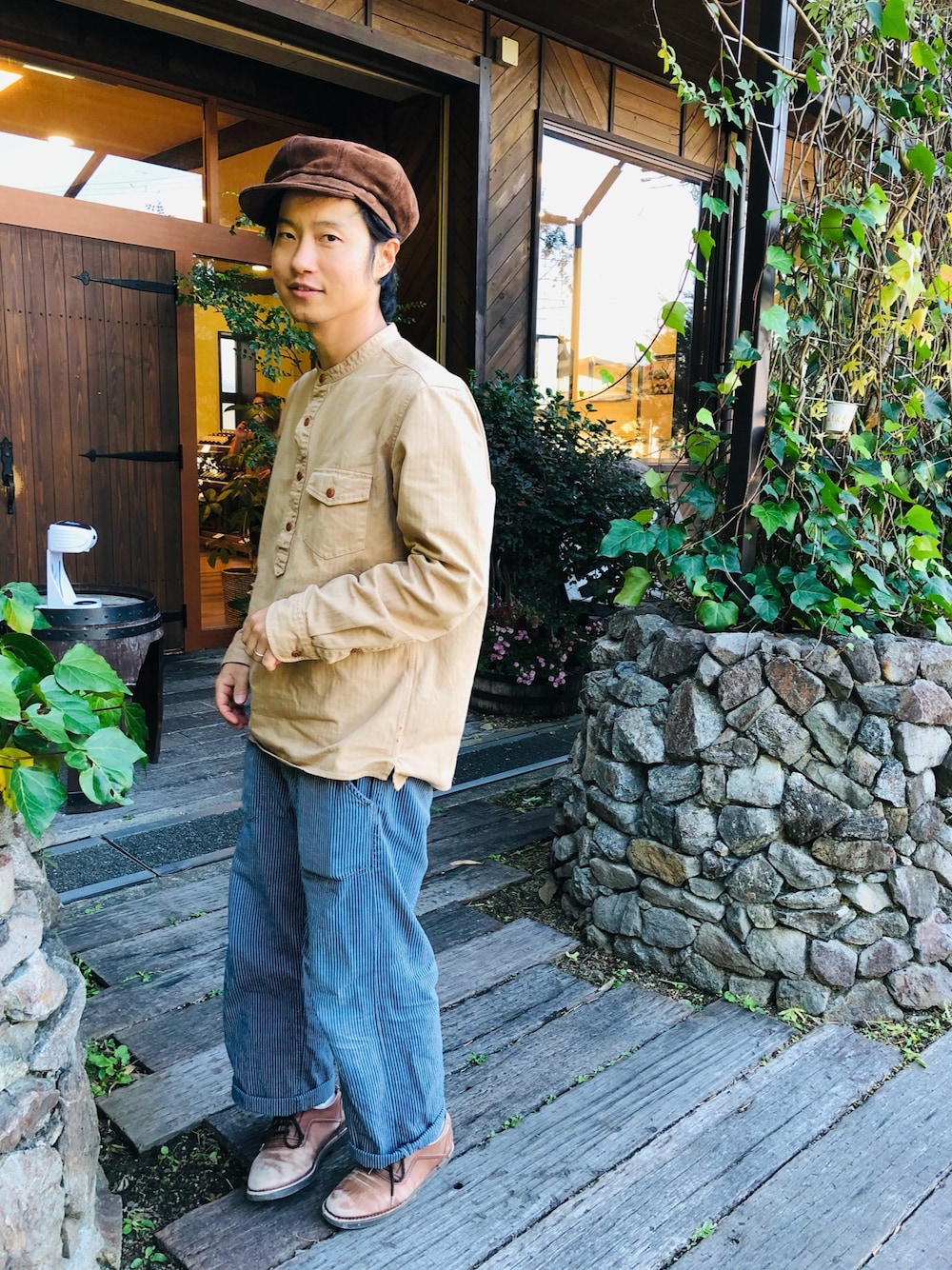 准平のキャスケット「NEW YORK HAT CASQUETTE ANTIQUE LEATHER SPITFIRE BROWN」を使ったコーディネート