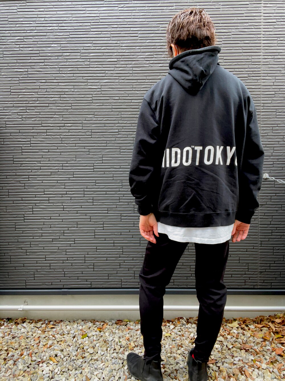オールブラック パーカーにレイヤード シックでカッコよく