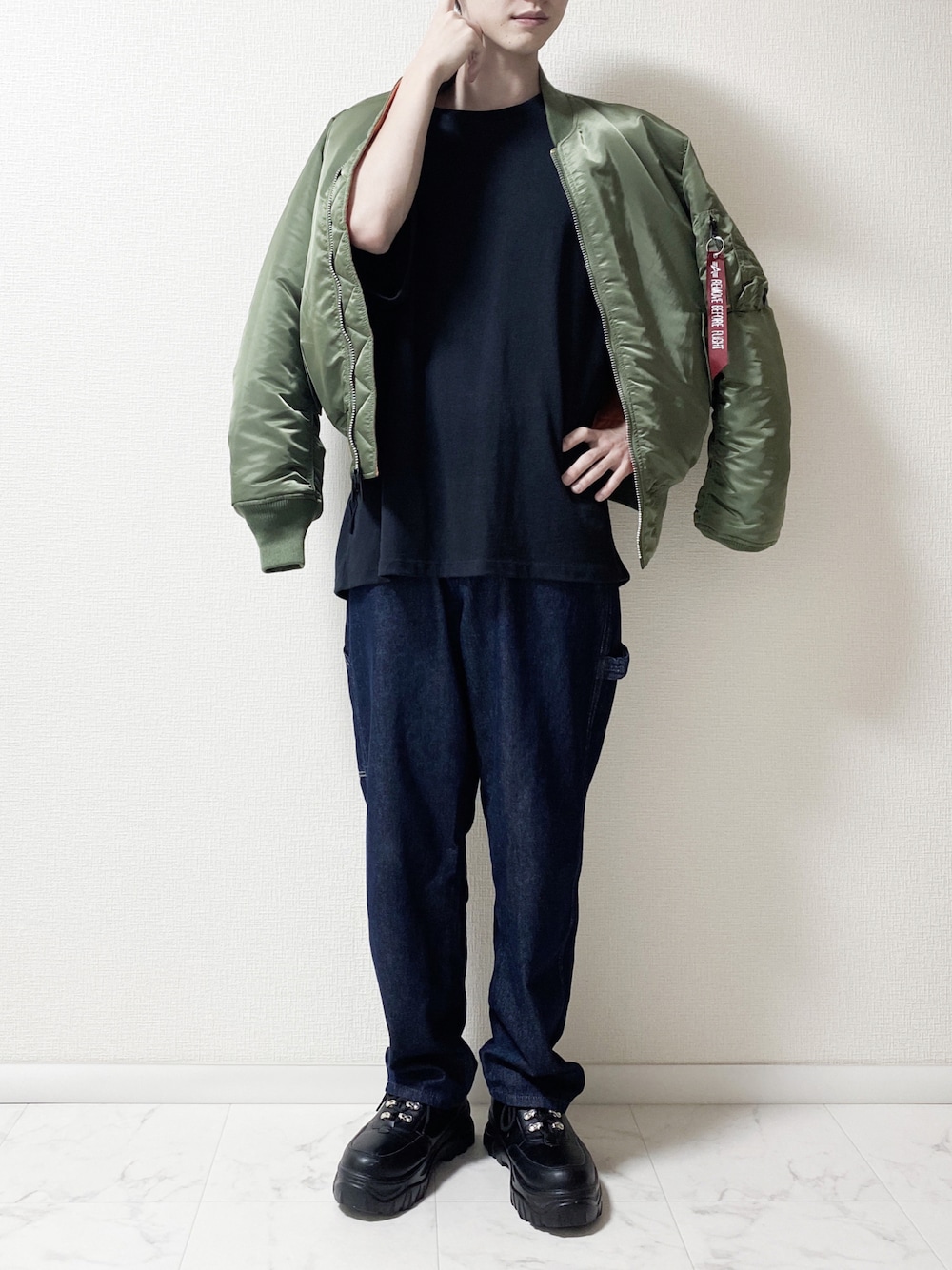 ▪️Instagram ⇨ @jun0604ps @j_ps64wear _ _ _ _ _ _ _ _ [ style ] _ _ _ _ _ _ _ _ _ MA-1×ワイドデニム👕 ブラック系ワントーンにMA-1を合わせた シンプルスタイル🕊 深めのグリーン、しっかりとしたシルエットのMA-1なのでこれから寒くなってくる時期でもオススメ🫰❤︎ ワイドデニムでゆるっとしたシルエットを出せるけど、スタイル悪く見えないのも高ポイント✨ _ _ _ _ _ _ _ [ contact ] _ _ _ _ _ _ _ _ ✍️ お仕事のご依頼等はプロフィールのInstagramよりお手数ですがメッセージを頂けると幸いです🍃 _ _ _ _ _ _ _ _ _ _ _ _ _ _ _ _ _ _ _ _ _ 🕊