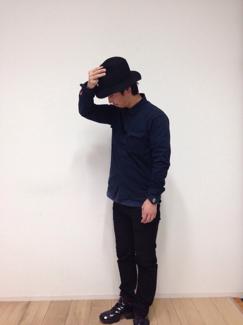 JUNRedのインナーとパンツを使いオールブラックに仕上げました。 オールブラックで作ったポンプフューリーとトレンドのつば広ハットをアクセントに。