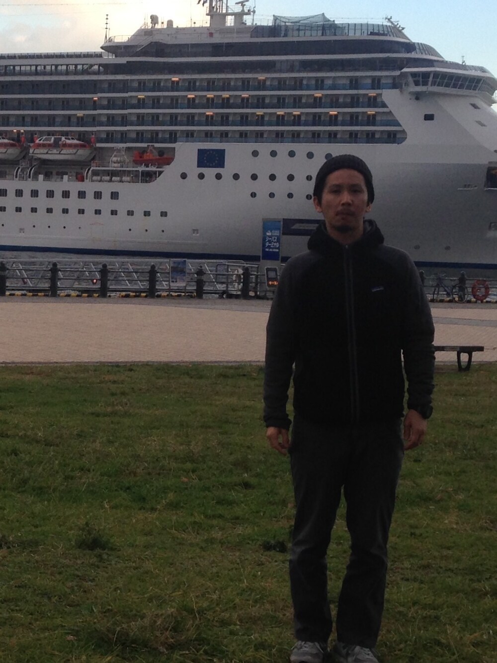 豪華客船のあまりの大きさに唖然。 アウトドアスタイルをブラックメインで。
