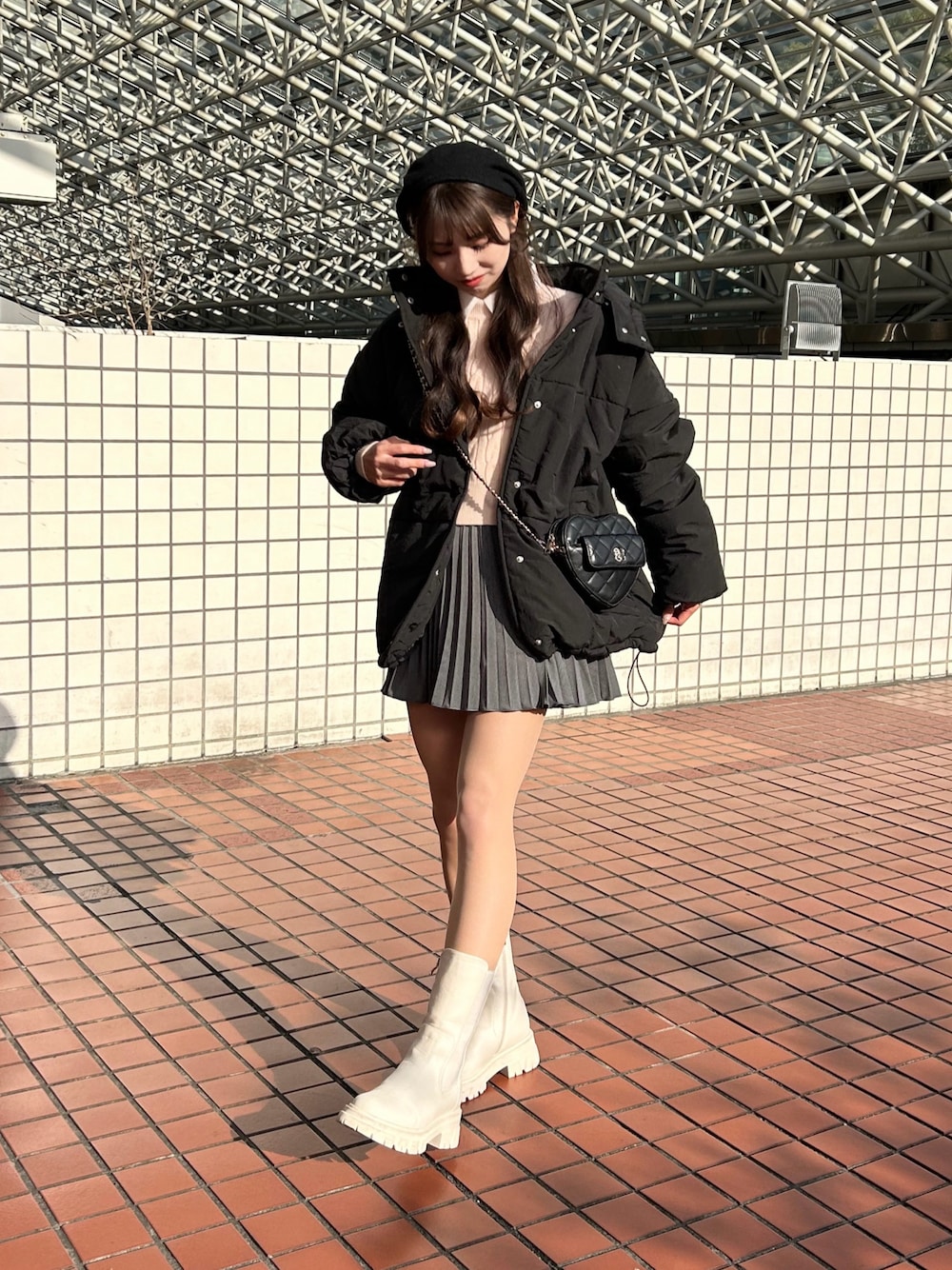 158cm / 骨格ウェーブ outer : F / ブラック 毎年絶対に使えるダウン🎀♡ ミドル丈なので158cmのわたしはミニ丈を履いてもすっぽり隠れるくらいの丈感で着ることができました.ᐟ.ᐟ ミニ丈×ロングブーツ合わせおすすめです🙆♀️💞 フードは取り外し可能ですっきり着ることもできるし、前開きもすべてボタンなので着脱が簡単です.ᐟ.ᐟ ボリュームがありすぎるわけではないので、着太りせずに着れて嬉しいです🪄♡ tops : F / ピンク ピンクのお色味がかわいいケーブルニット🎀♡ 短丈のシルエットなのでアウトスタイルで着てみましたが、ハイウエストのボトムスだとインもしていただける丈感になっています.ᐟ.ᐟ ピチッとしすぎていないので、中にシャツを入れるなど着込むこともできます.ᐟ.ᐟ フレンチガーリーさんはブラウスの襟を出して着るなどもかわいいと思います🪄♡ skirt : F / グレー 珍しい細めのプリーツデザインのミニスカート.ᐟ.ᐟ プリーツが細めなので揺れ感が綺麗でかわいいです♡ スカートの中がパンツっぽく分かれているので1枚で安心して履いていただけます🎀♡ ロングブーツ合わせも安定にかわいいのでおすすめです👢♡