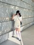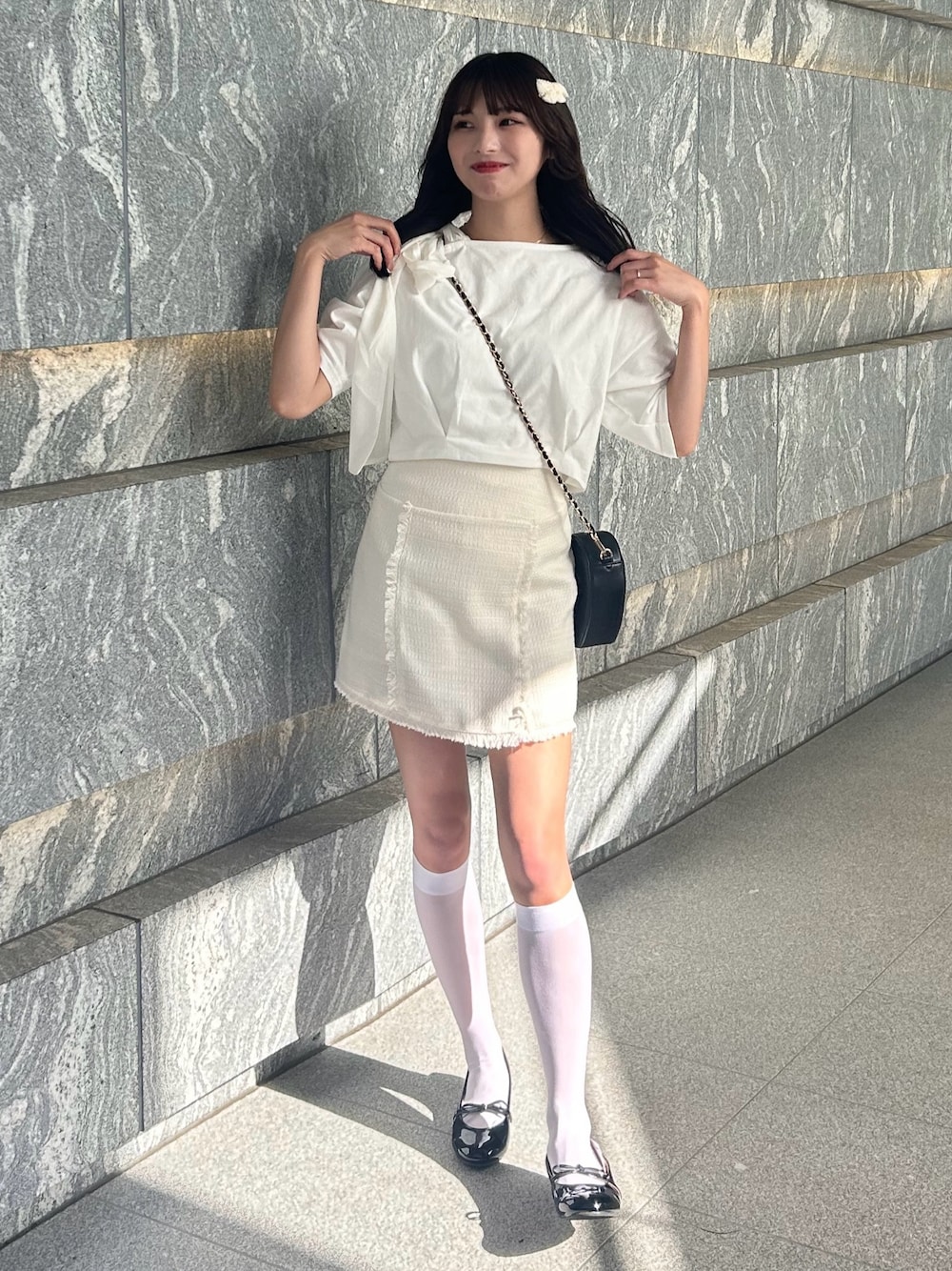 158cm / 骨格ウェーブ tops : F / オフ 肩にリボンが付いたタイプのTシャツ♡ 肩にのせて着ても、ワンショルにしても大人可愛く着れたのでおすすめです✨ リボンは取り外しも可能なので、シンプルなTシャツとして着れるのも嬉しい.ᐟ.ᐟ 丈感短めなので、インしなくてもスタイルアップして着ることができました💞 skirt : F / アイボリーツイード 夏先でもさらっと履いていただけるツイードのスカート♡ 後ろがレースアップになっているのでウエストも楽ちんで、着脱も簡単!お腹いっぱい食べても安心していただけます😋♡ いつもナイスクラップから出ているミニスカートよりも丈感長めなので、短すぎるのが苦手な方でも履いていただけそうです.ᐟ.ᐟ ハイウエストで履くとスタイルアップしておすすめです🪄♡ 身長158cmで丈感このくらいでしたが、中はパンツっぽく分かれているのでそこも推しポイント✨