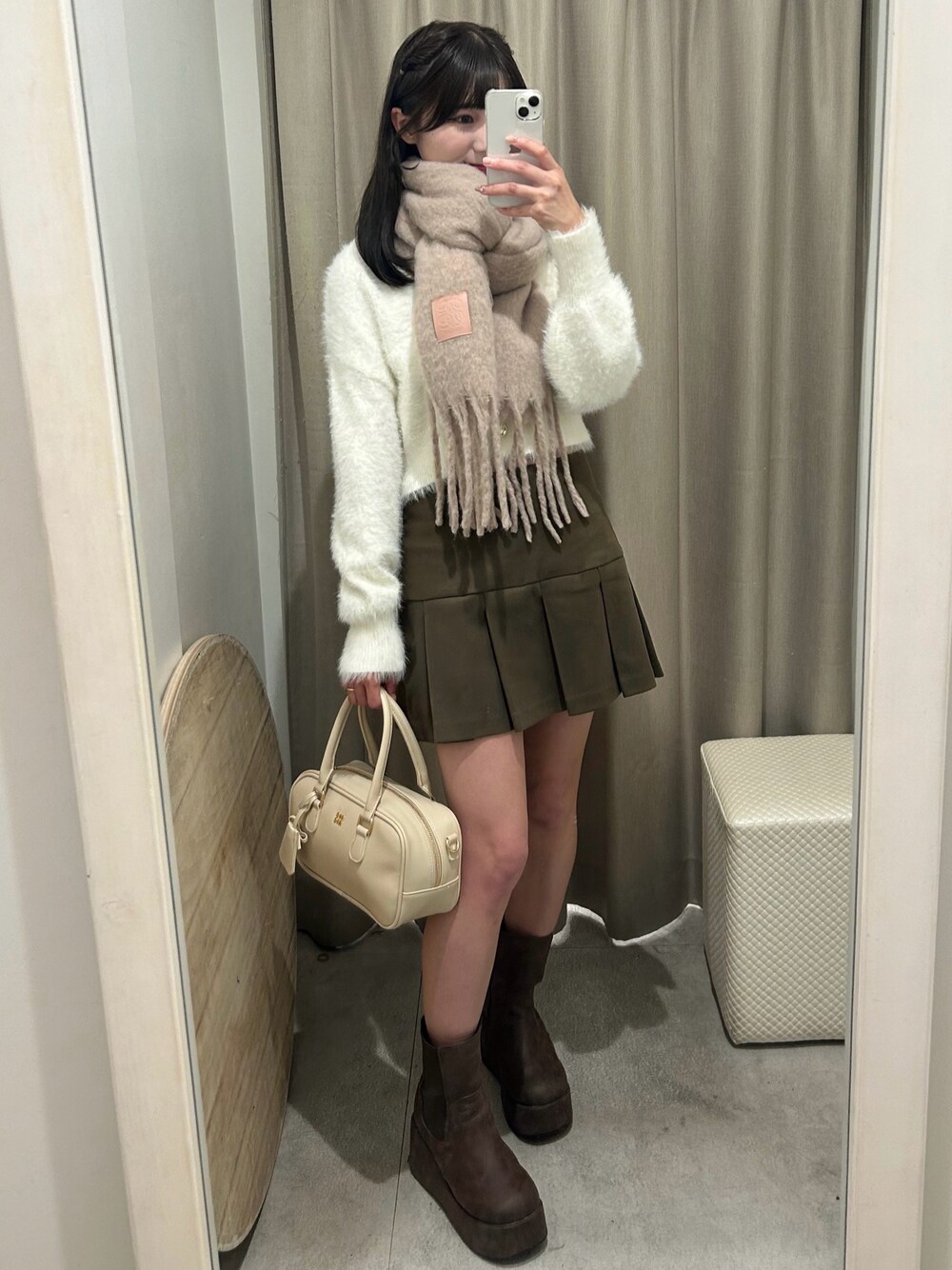 158cm / 骨格ウェーブ tops : F / アイボリー ふんわりしたフェザーの素材がかわいいカーディガン♡ ボリュームがありすぎるわけではないので、着膨れせずに着ていただけます!! フェザーなのでチクチクすることもなく肌触りもよかったです💭🩵 スカートやデニムの上に着てトップスとしても、ワンピースの上に着て羽織りとして着ても可愛かったです♡ 丈感短めなので普段ハイウエストのボトムスが多い方やすっきり着たい方におすすめです✨ skirt : S / モカブラウン 冬らしい素材感がかわいいミニスカート❄️ 中はスカパンになっているので1枚で安心して着ていただけます!! 色味もかわいく、ハイウエストのデザインと切り替え位置も低めですっきり着れるのでシンプルなトップスでも相性がいいです👏🏻🎀 158cmでSサイズ着用していますが丈感ちょうどよかったです! 普段ミニ丈慣れていない方はMサイズでちょっと丈感長めに、ロングブーツなどと一緒に履くのがおすすめです!! ウエスト緩く感じたので厚手のトップスをインして着るのもおすすめですが、骨盤で止まるのでインしなくても特に問題はなかったです!