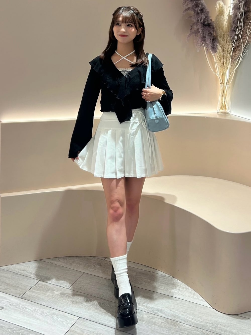 158cm / 骨格ウェーブ / イエベ春 [足のサイズ : 23〜23.5cm] [Instagram : @jun_s2nc] tops : Fサイズ / ブラック×オフ インナーと2枚セットになってるカーディガン♡ インナーにリボンとレースが付いていたり、トレンドのホルターネックもできるようになっているのでシンプルすぎずに着ていただけます💞 カーディガンのフレア感も可愛く、シンプルなインナーなどに合わせて着ていただくのもおすすめです! キャミワンピなどの羽織りとして使っても可愛かったです🪄♡ skirt : Mサイズ / オフ 季節感問わず履けるプリーツスカート💘 ウエスト部分も太めに切り替えが入っているので、すっきり着ていただけます♡ リボンのデザインも可愛くシンプルなトップスとも相性抜群です!! 中はインパンも付いていて、158cm Mサイズ丈感このくらいだったのでかなりスタイルアップして履いていただけると思います!! いつものスカートより丈が短めだったので、ミニ丈を履きなれていない方や155cm以上の方はMサイズがおすすめです!