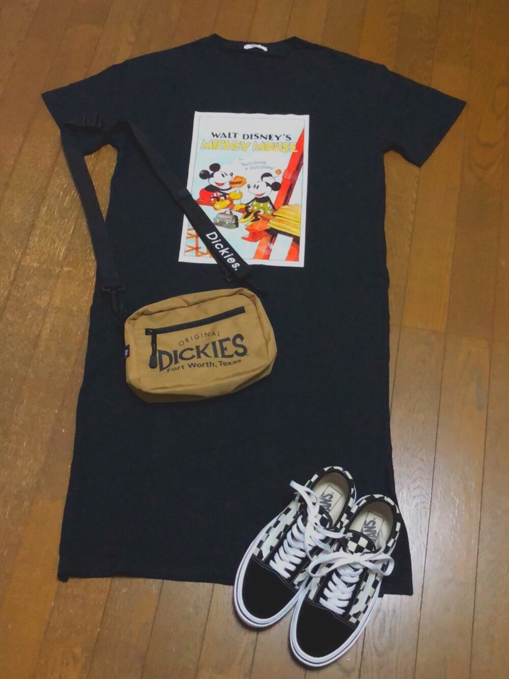 レトロな感じにしてみました! Tシャツとバッグ共にしまむらで購入したものです♪ ワンピース1枚のみで楽チンです(*´ω`*)