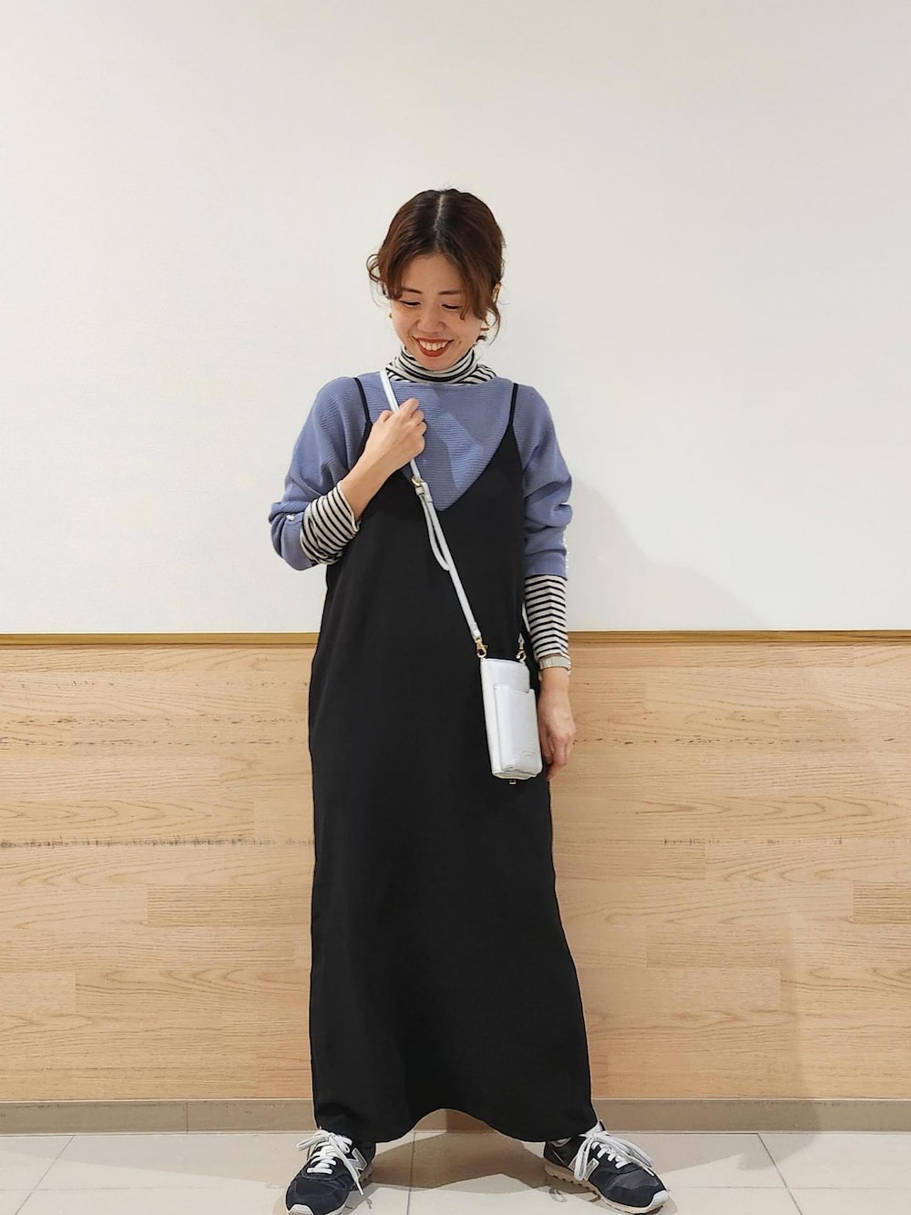 ドルマンニットを休日用でも使えるイメージで組み合わせました。 ボーダータートルを重ね着することで、コーディネートのポイントになるようにしました。