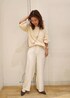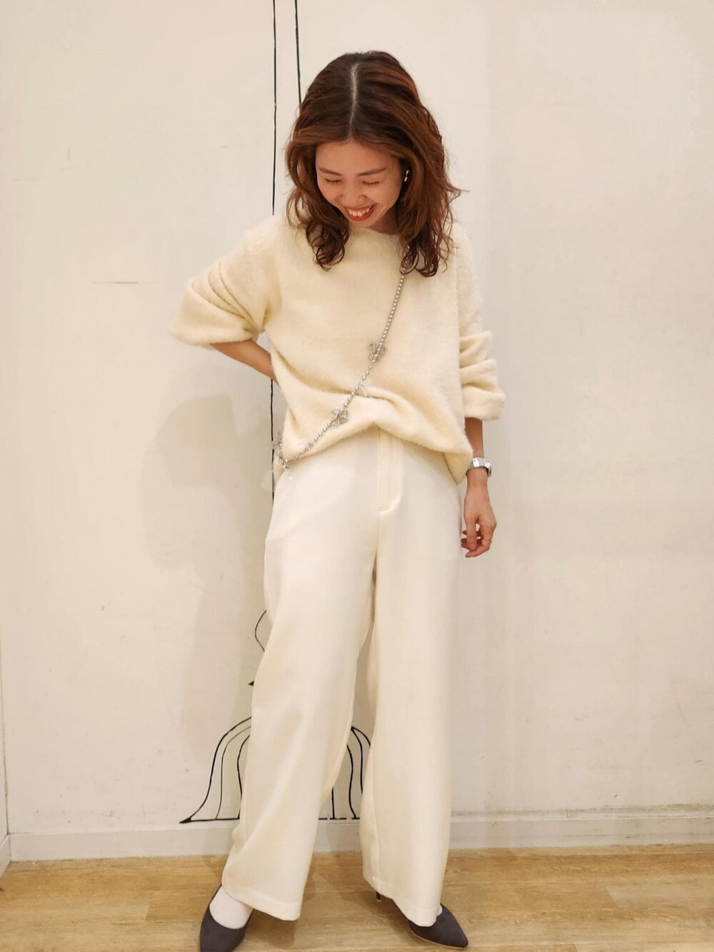 シャギーニットに防汚加工のワイドパンツでホワイトコーデにしました。 スマホショルダーとパンプスをグレーでまとめることで、洋服が際立つようにしてます。