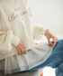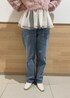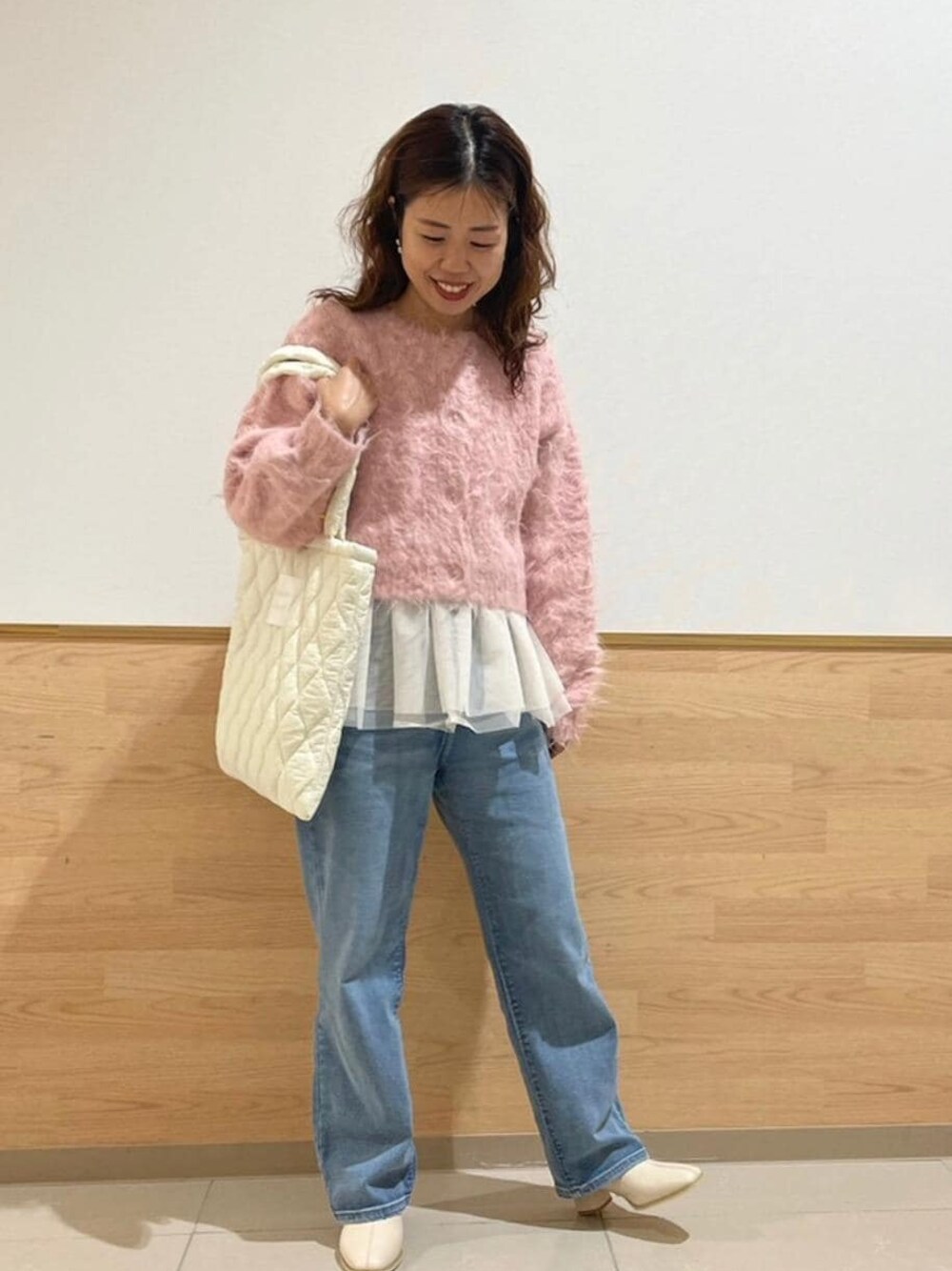 毛足の長い起毛ヤーンのカーディガンに、チュールインナーを合わせて甘めな印象に。 デニムでカジュアルさを足してバランスを取りました。