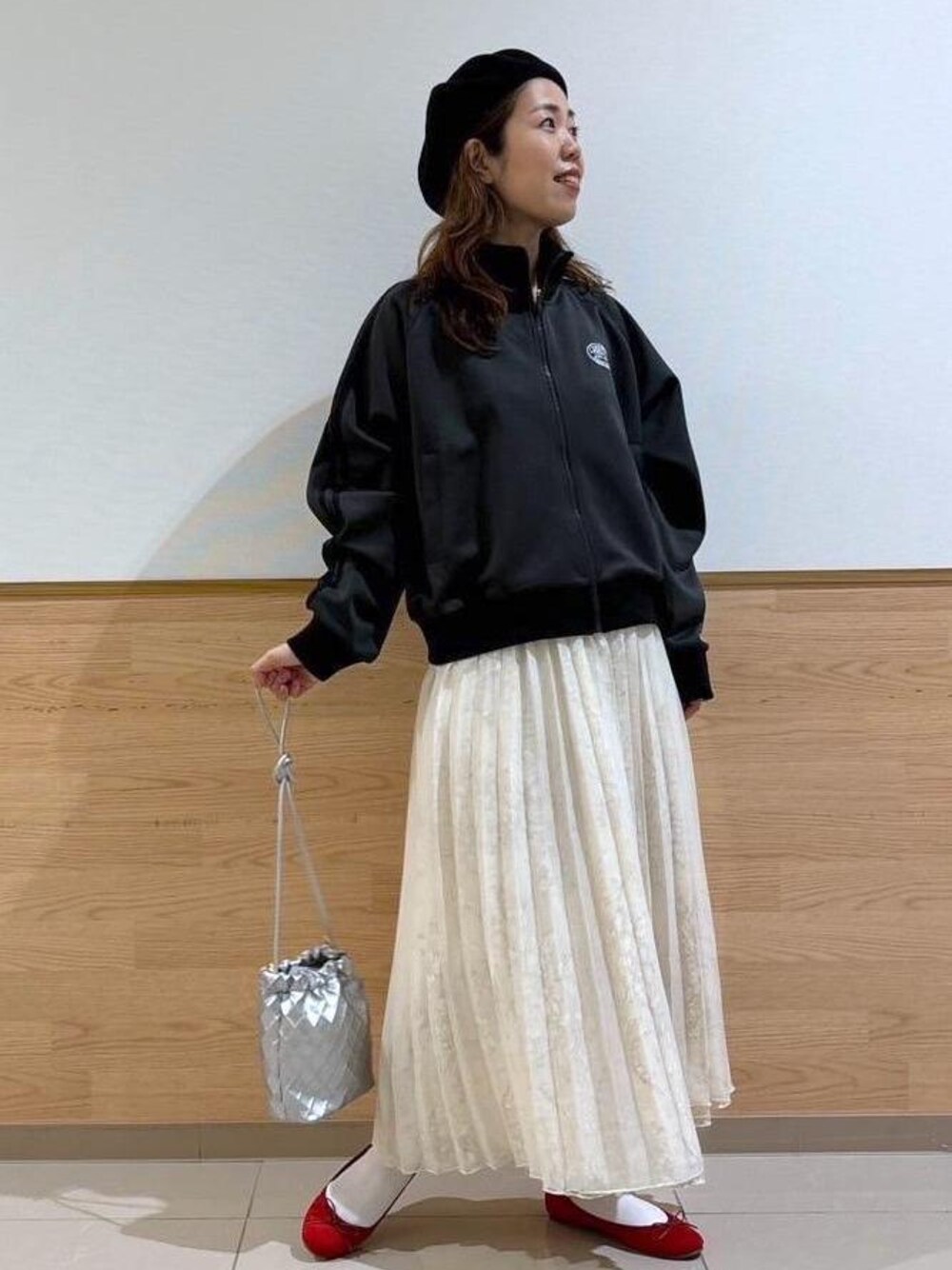 今年注目のトラックジャケットを女性らしくプリーツスカートで合わせました。 スカートはリバーシブル仕様なので、気分によって変化できるのでお得感のある1着です。