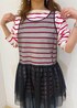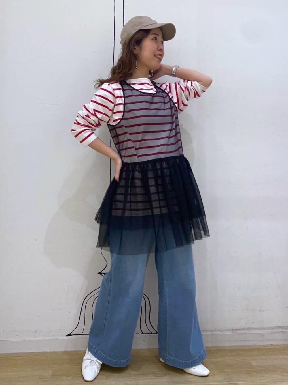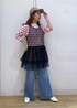 ボーダーのトップスにチュールベストをレイヤードして今年らしさを出しました。 足元はスニーカーにせず、パンプスで女性らしさをプラスしたコーディネートにしてます。