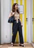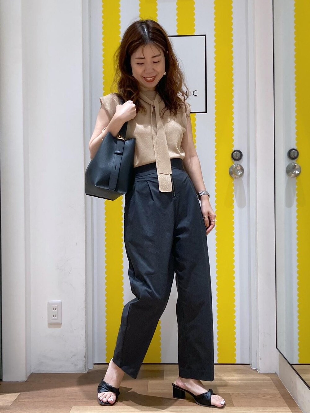 ラメのシアーニットとZIPパンツで、オフィスカジュアルなコーデにしました。 小物をブラックでまとめ、統一感をもたせてます。 ニットは、ラメがあり華やかな印象に。