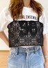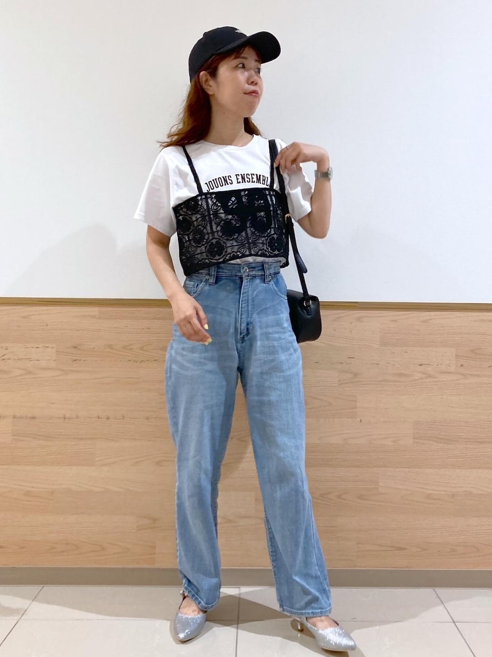 Tシャツとデニムに、レースビスチェをプラスすることで一気にこなれて見えます。 総レースが女性らしく仕上げてくれます。