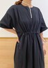 季節の端境期に何を着るか悩むことが多いですが、時短で決まるワンピースがあれば、安心です。 ウエストのドローコードでしぼれるので、楽だけど自然にスッキリ見せてくれます。 カットソーのワンピースに、ジャケットを羽織ればきちんと感が出るのでおすすめです。 ネックレス、パンプスは私物です。