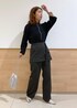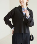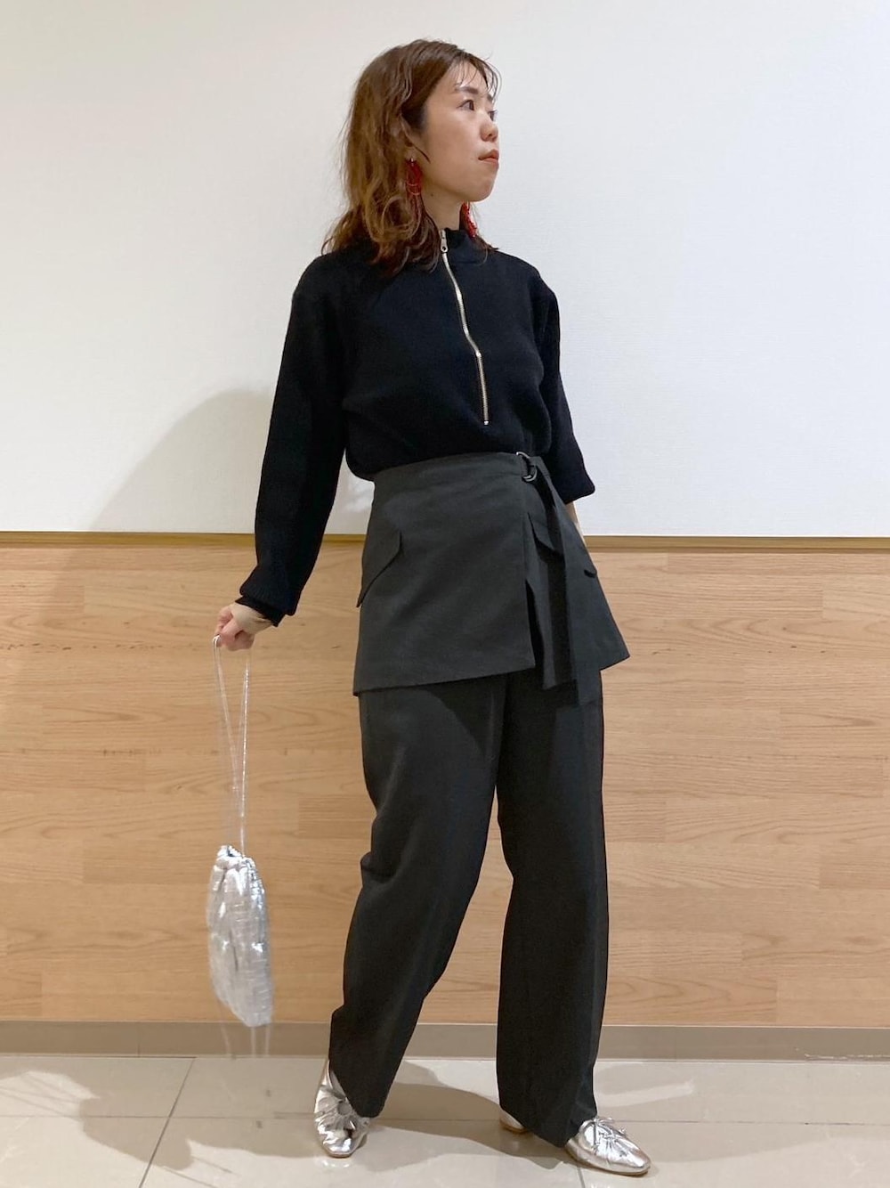 ジップニットのインナーにキャメルのシアートップスを重ねて、ポイントにしました。 ボトムのグレーに合わせて、パンプスやバッグはシルバーでまとめてます。