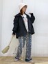 ミッキーのロゴがかわいいスウェットに、デニム+スカートのレイヤードで、女性らしさをプラス。 足元と、帽子でウォーム感を足して、季節感を出しました。 アウターは軽くて手軽に着やすく、ゆったりしてるので厚手なニットの上にもさらっと着れて便利です。