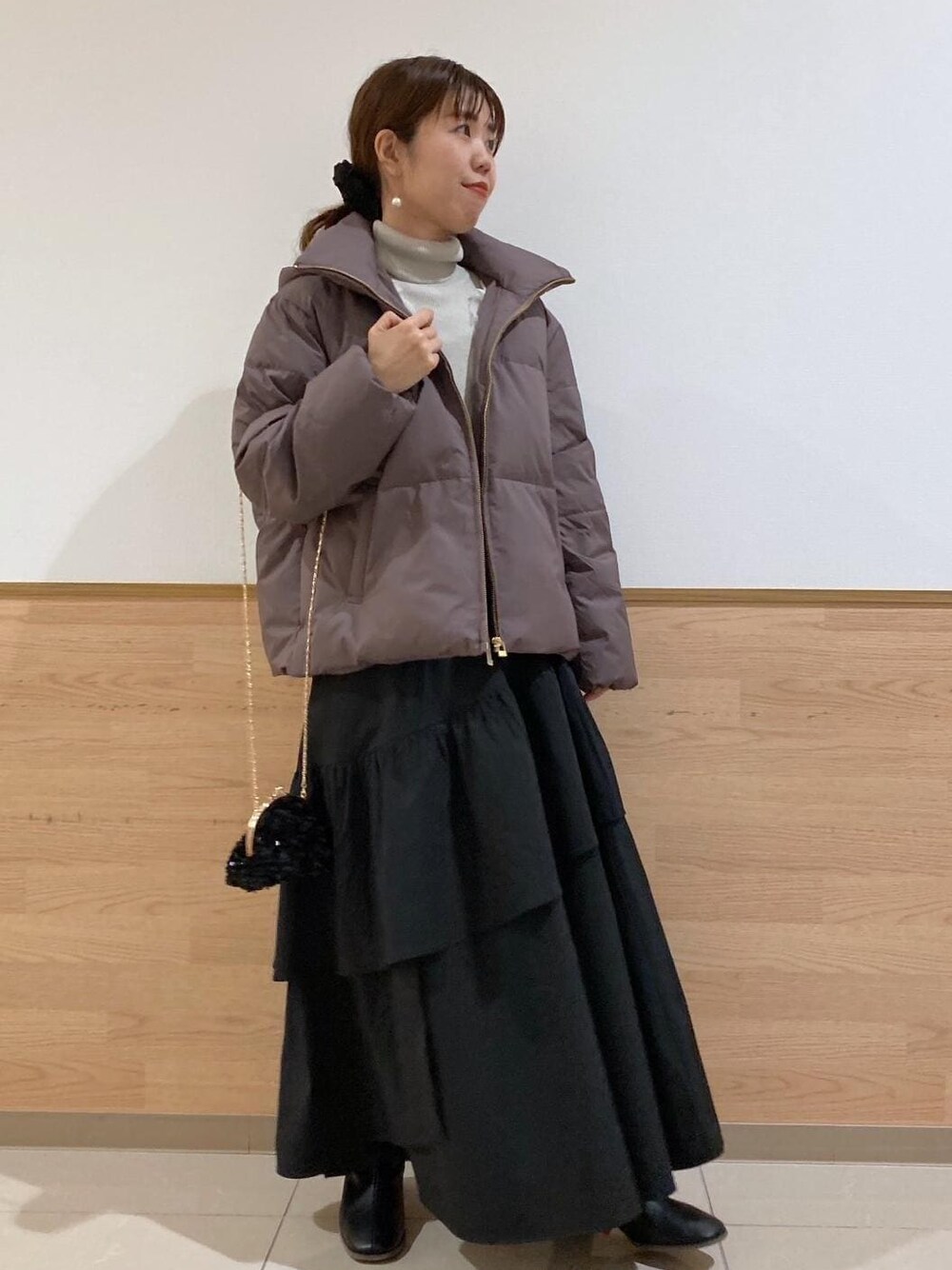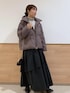 軽くてあたたかいダウンは、冬アウターとして推しのコート。 今年はブラウンが新色で入荷しました。 丈がコンパクトなので、低身長の方にもおすすめです。 インナーはチュールベストとティアードスカートで、フェミニンさをプラスしました。