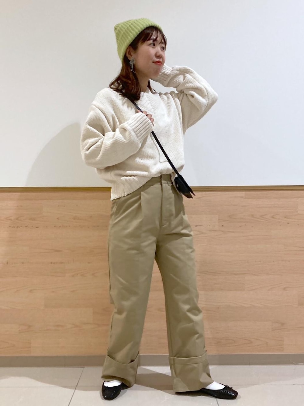 ホリデーシーズンにぴったりな、キラキラニット。 甘さのあるニット素材をチノパンツでカジュアルダウンさせています。 全体的にベーシックカラーにまとめて、ニット帽でカラーをプラスしました。