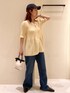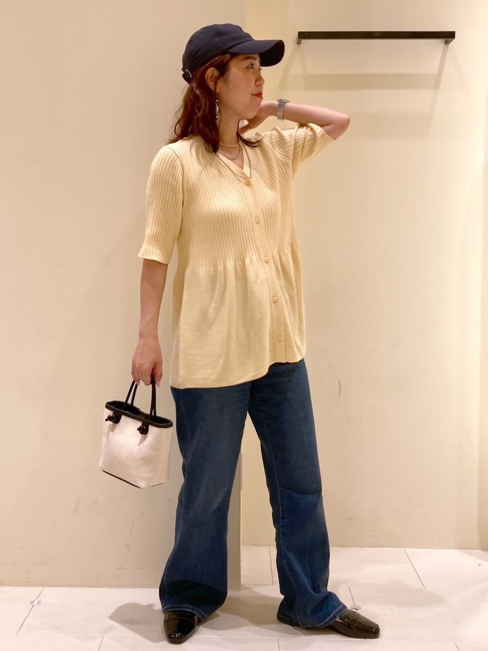 柔らかなクリームイエローのペプラムニットに、デニムあわせを合わせました。 ペプラムニットが可愛い印象なので、小物はカジュアルダウンさせてコーディネートしています。