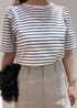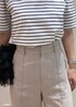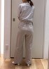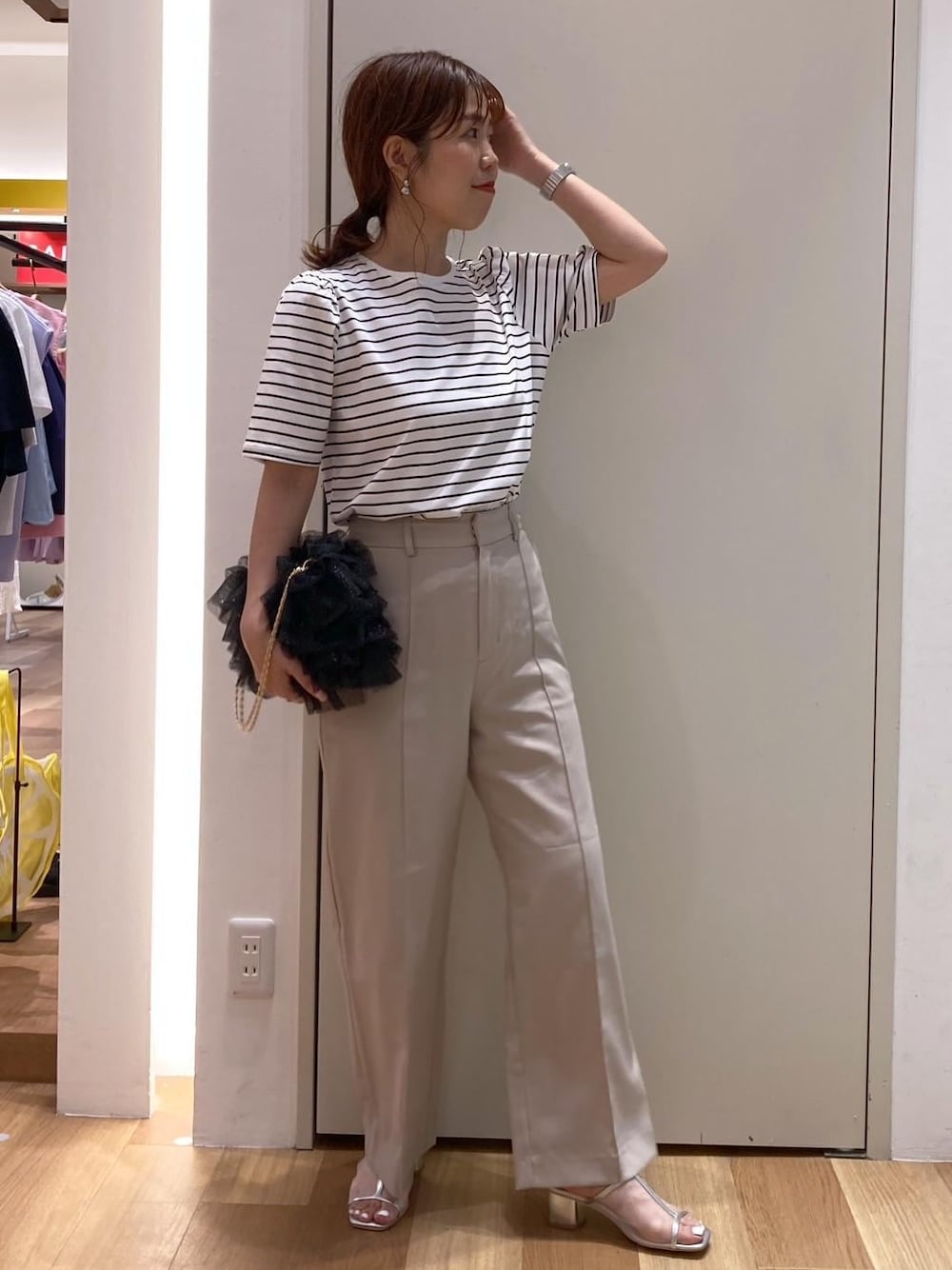 ボーダーにパンツとシンプルなあわせに、チュールのバッグをプラスしアクセントに。 ワイドパンツは、フラットヒールでも可愛いですが、ヒールがあることでより脚長効果を期待できます。