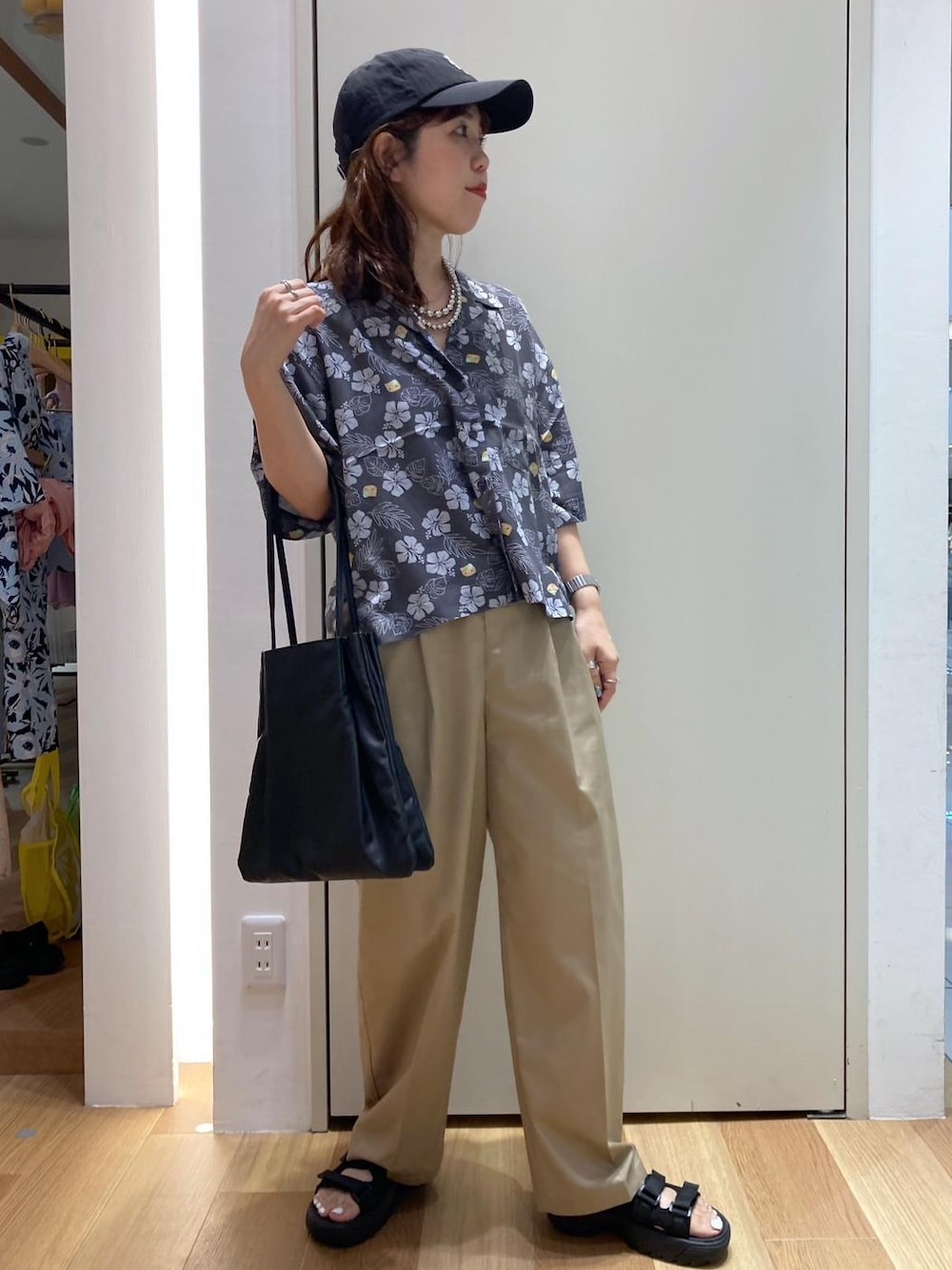 ハローキティとのコラボアイテム。 柄がポイントなので、その他はベーシックカラーでまとめました。シャツは落ち感のある素材がラフすぎない印象に。羽織としても着れるので、着まわししやすいアイテムで夏のお出かけにぴったりです。