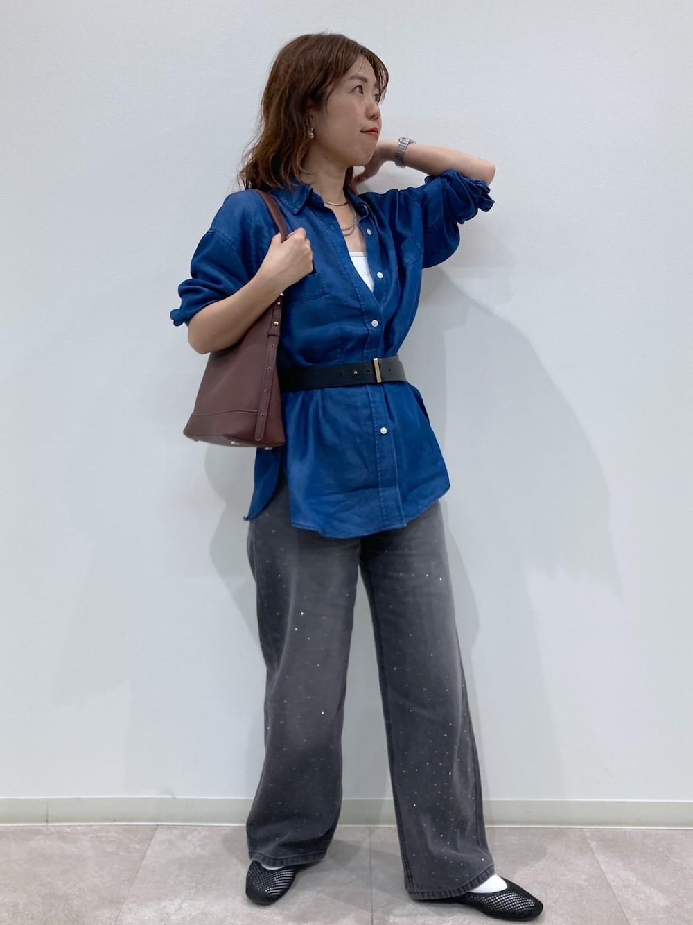 オーバーサイズのデニムシャツにキラキラデニムを合わせました。ネイビーとブラックで、秋見えする印象に。 差し色でワインのmefitバッグをプラスしました。 ※紐付けしていないアイテムは、私物です。
