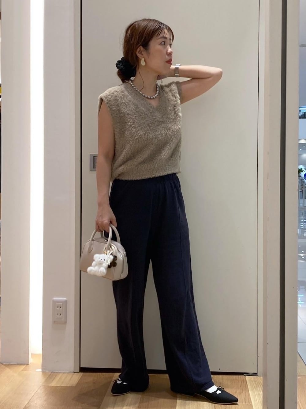シャギーショートベストをスウェットパンツでカジュアルに。 足もとはパンプスでバランスを取りました。 ※紐付けしていないアイテムは私物です。