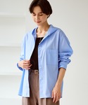 フード付きシャツに、ストライプのキャミワンピースで楽に動きやすいコーディネート。 ブルーとグレーの相性がよく、顔回り明るく見せてくれます。小物はブラックでまとめて、服が引き立つようにしました。