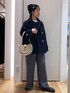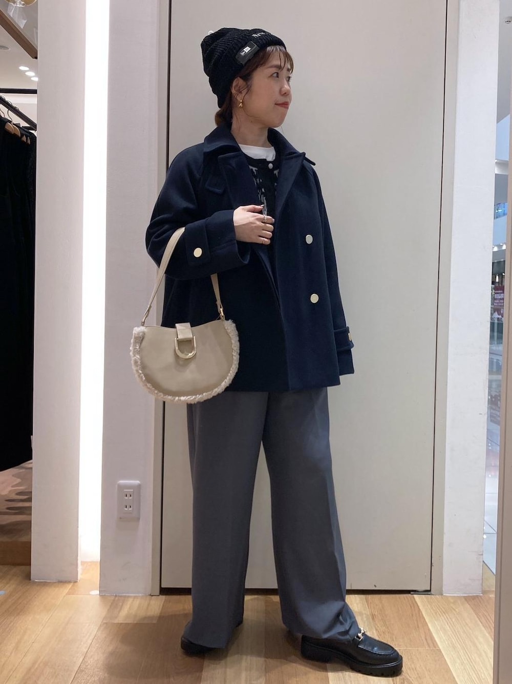 ノルディック柄のカーディかンが主役になるように、その他のアイテムはベーシックカラーでまとめました。 コートは、オンオフ兼用できるコートで、ゆとりがあるので厚手なニットやスウェットの上からも楽に羽織りやすいデザインです。