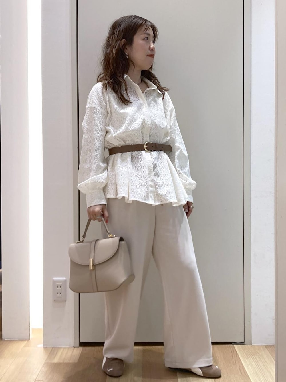 洋服をホワイトで色味をまとめて小物はキャメル統一した、春らしいコーディネートにしました。