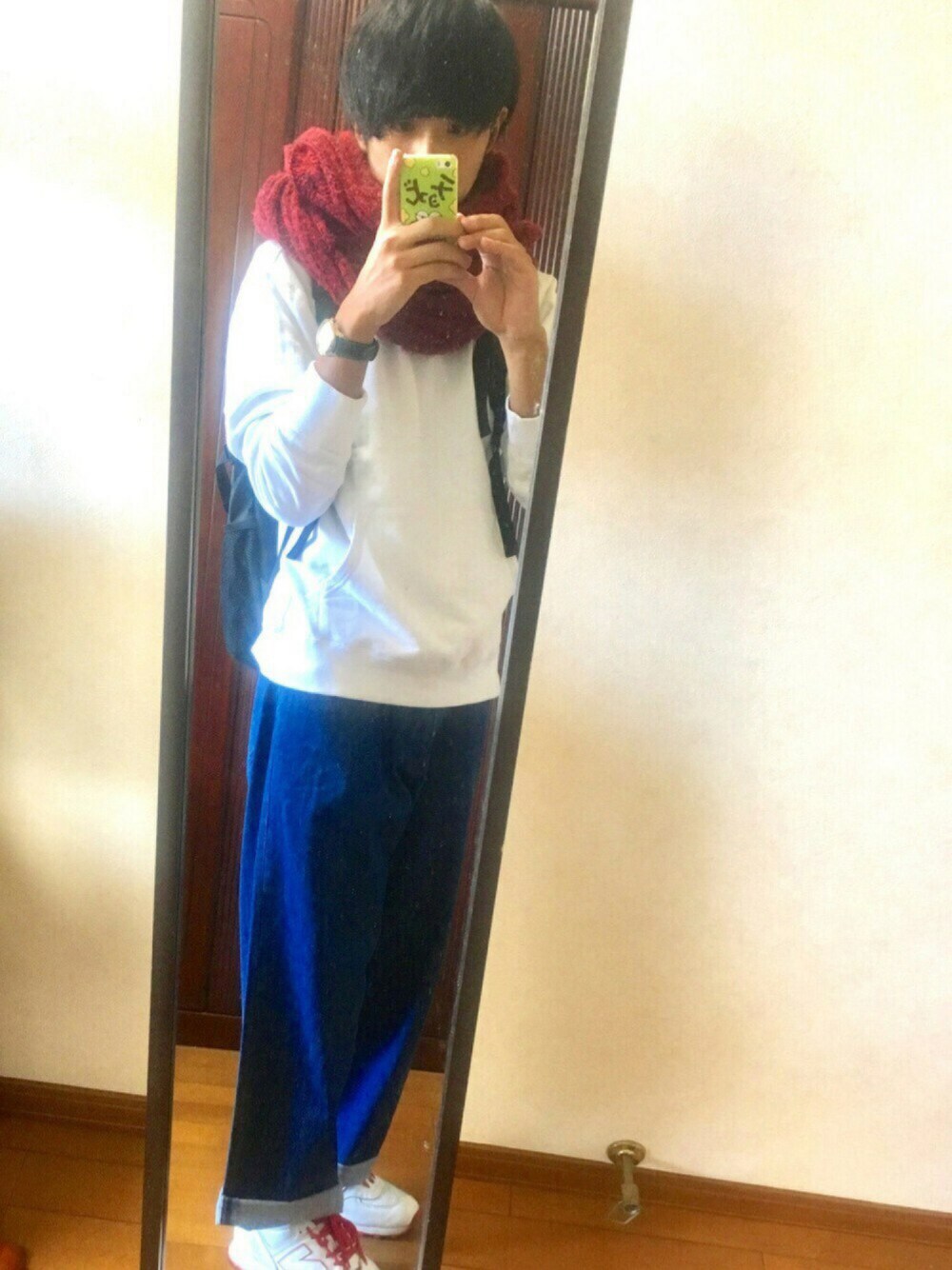 ワイドパンツにジャストサイズのパーカーでAライン意識しました! スニーカーの選択が難しい。。。 最初はエンジのサッカニーでいいかな〜?って思ったけど、 赤のスヌード巻きたかったから、 結局白のニューバランスに(笑) いつもはスキニーばかり履いてるから ワイドパンツ新鮮! パンツは割とUNIQLOとかGUだけど、 ちゃんとゾゾタウンで買いました(笑)