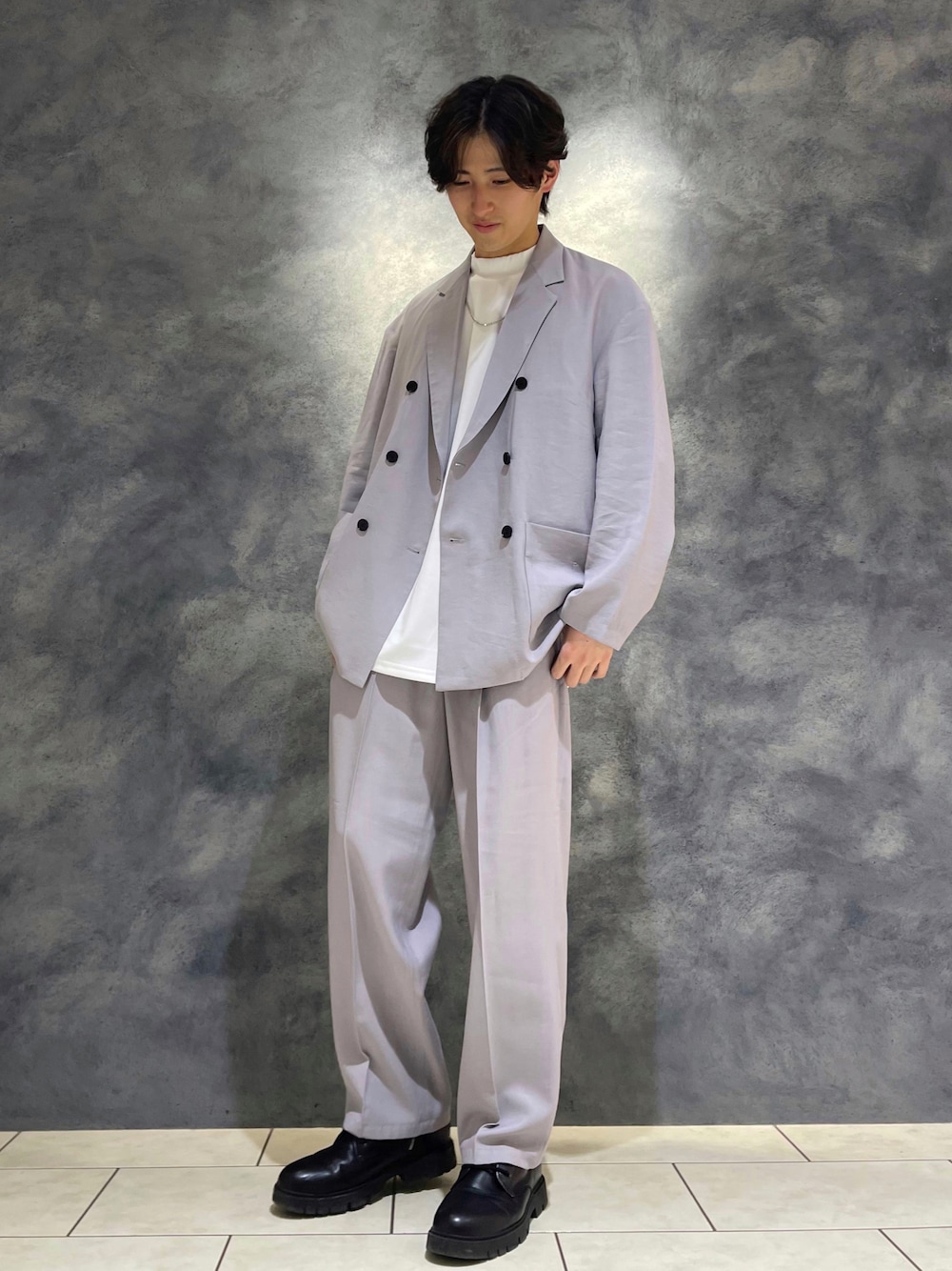 Junyaのスラックス「ドレープテクスチャー1タックストレートパンツ」を使ったコーディネート