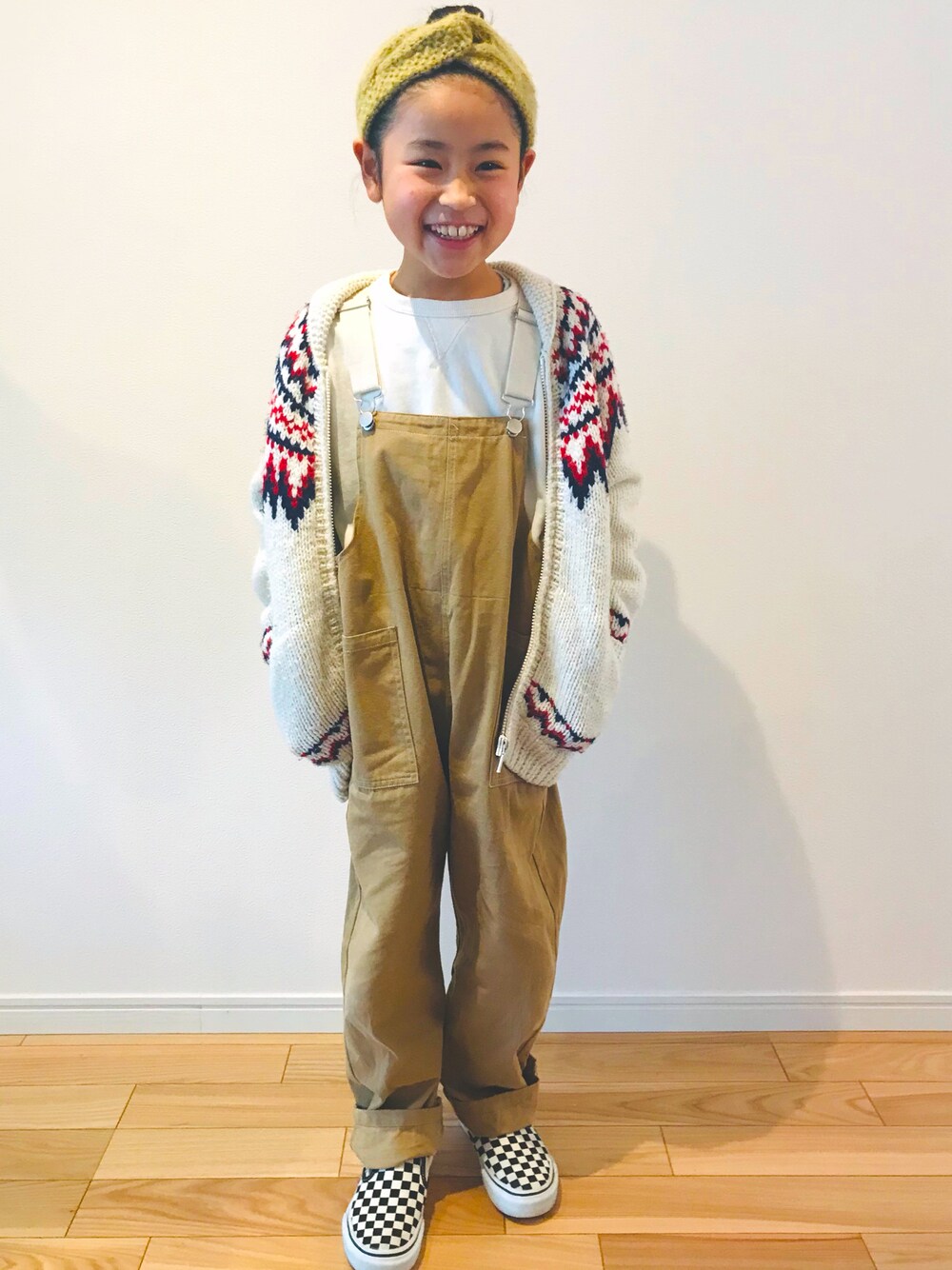 2コーデ目 長女ベージュサロペットコーデ
