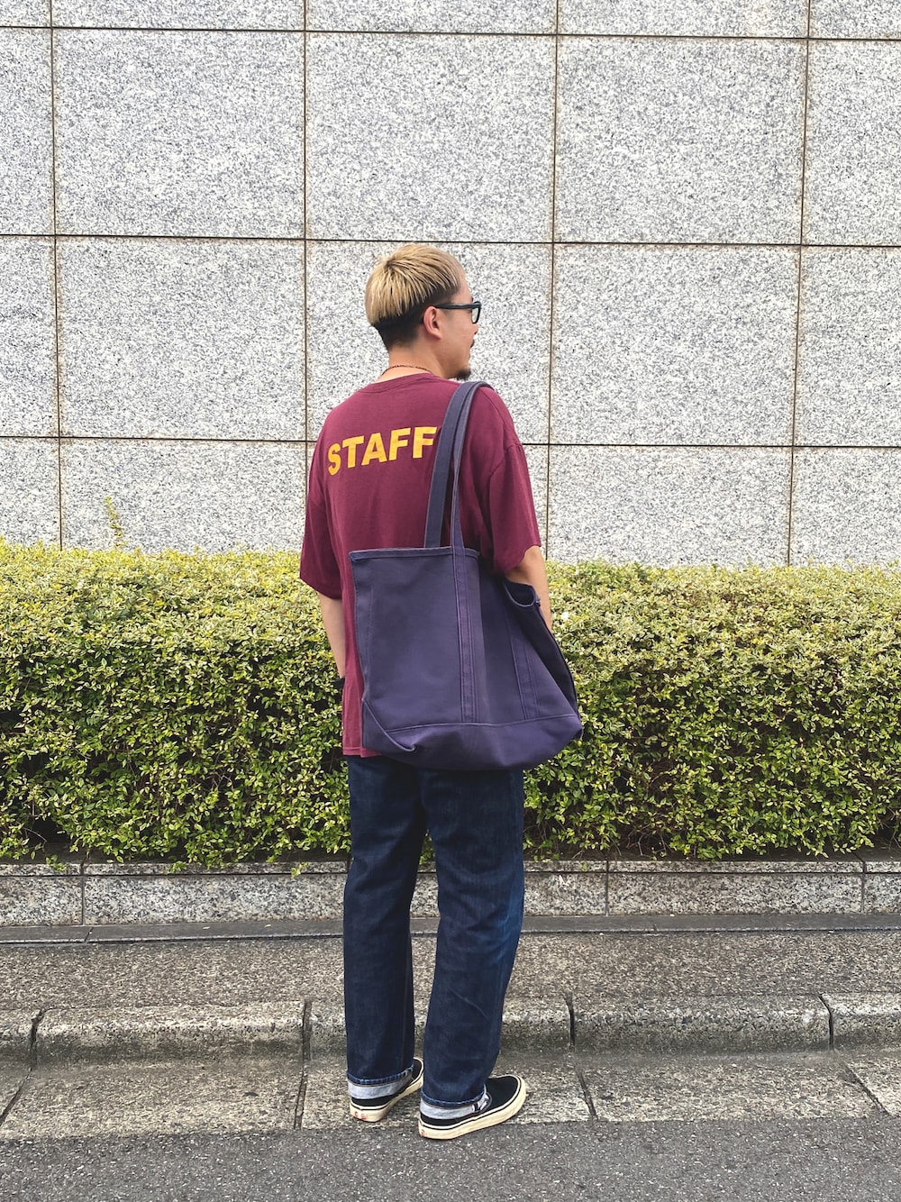 なにもない日のただ買い物にいくだけ。 色褪せたネイビーのエルエルビーンに 【古着】のTシャツ。 なんの“スタッフ”かは不明。 なにも考えずツータックスのデニム。
