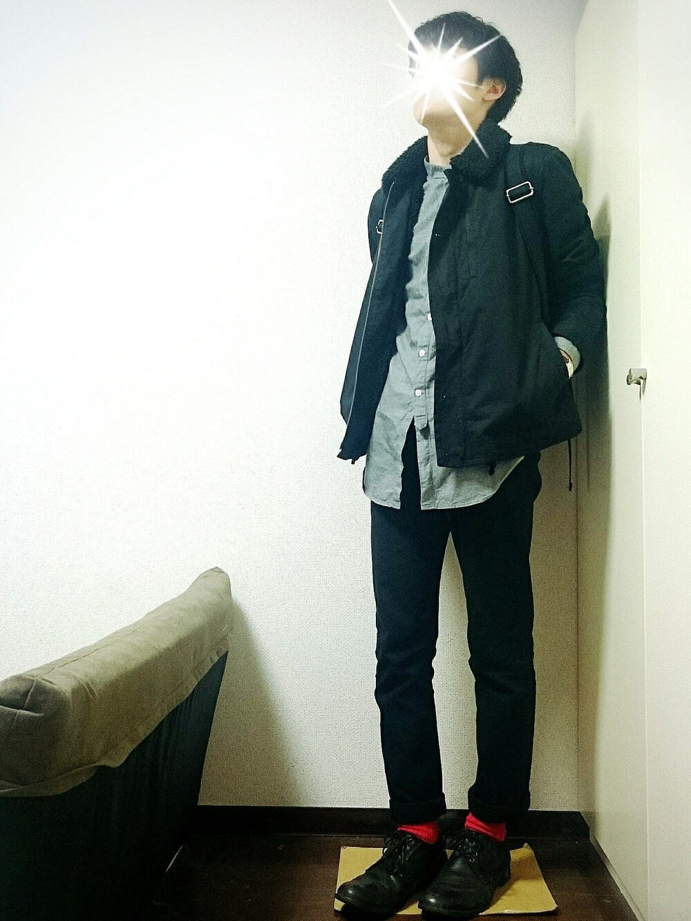 いいね、セーブありがとうございます! いやぁ、急に寒くなってきましたね… 風邪など大丈夫ですか? そんなこんなで今回はほぼ冬コーデ! もうアウターを着ることになるとは…(笑) でもまぁ超寒いってわけではないので、アウターの中はシャツとロンT1枚(^_^) 全体を黒でまとめてーの赤ソックス。 定番ですね◎