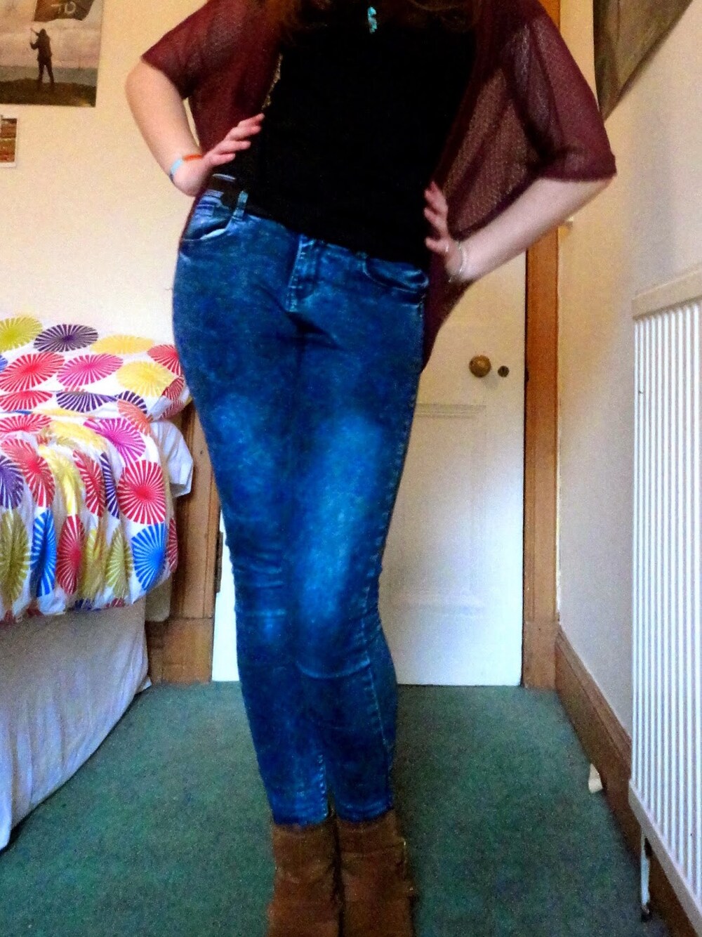 A light string cardigan for warmer weather, and acid wash jeans to mix things up a little